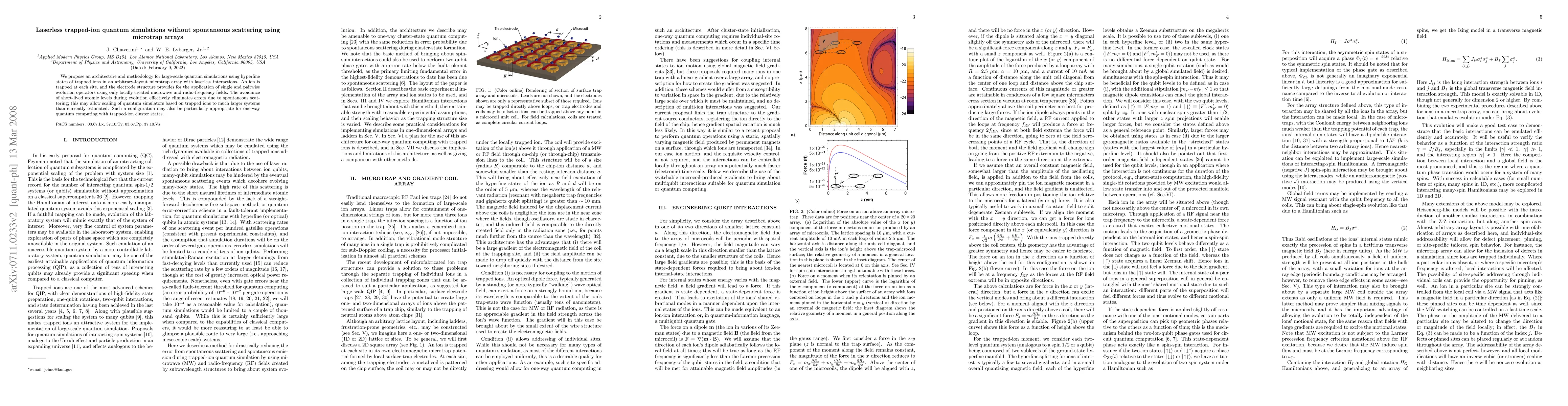 This paper proposes a laserless architecture for large-scale quantum simulations using trapped ions in microtrap arrays, utilizing microwave and radio-frequency fields to apply evolution operators without spontaneous scattering errors, potentially enabling scalable quantum simulators. The method may also support one-way quantum computing with trapped-ion cluster states.