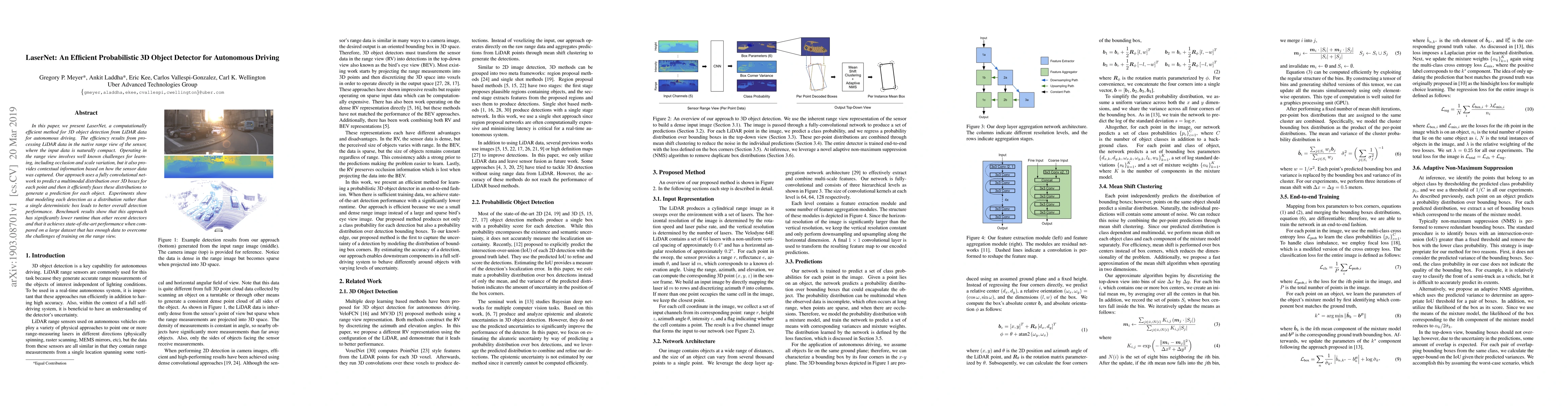 LaserNet is a computationally efficient 3D object detector for autonomous driving that processes LiDAR data in its native range view, leveraging a fully convolutional network to predict multimodal distributions over 3D boxes. This probabilistic approach outperforms deterministic methods and achieves state-of-the-art performance with significantly lower runtime.