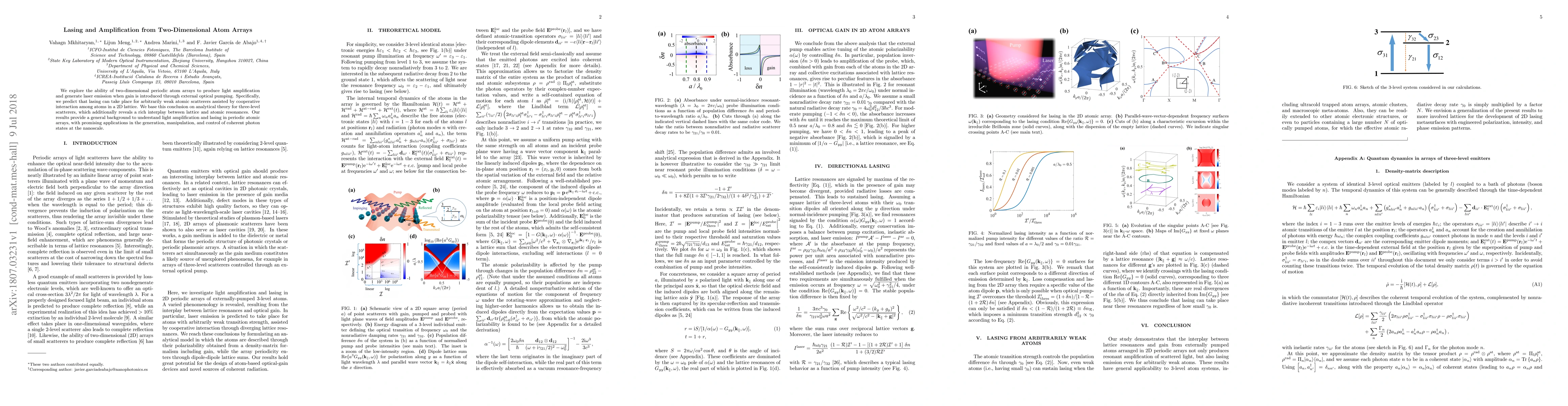 This paper investigates the potential of two-dimensional atom arrays to amplify light and produce laser emission via external optical pumping, demonstrating that cooperative interactions among atoms in a 2D lattice can enable lasing even from weak scatterers. Analytical theory for three-level scatterers reveals complex interactions between lattice and atomic resonances, offering insights into coherent photon state manipulation at the nanoscale.