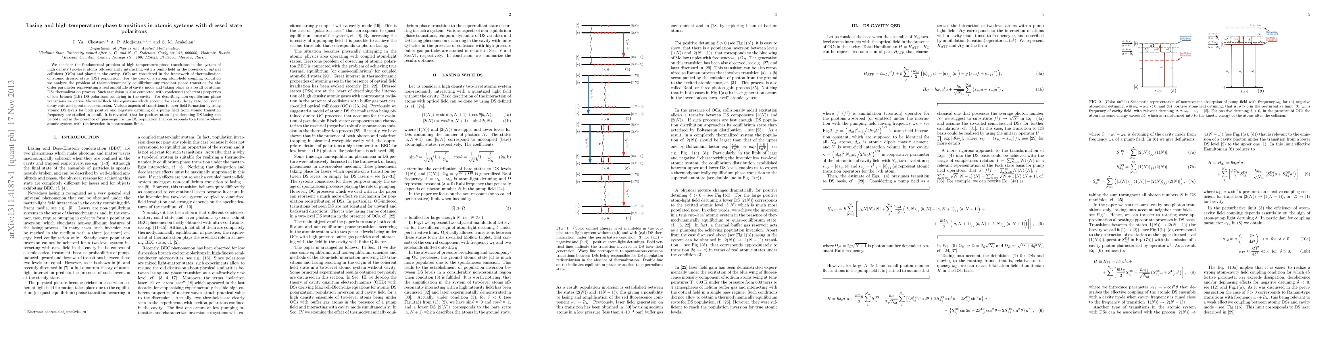 We consider the fundamental problem of high temperature phase transitions in the system of high density two-level atoms off-resonantly interacting with a pump field in the presence of optical collisions (OCs) and placed in the cavity. OCs are considered in the framework of thermalization of atomic dressed state (DS) population. For the case of a strong atom-field coupling condition we analyze the problem of thermodynamically equilibrium superradiant phase transition for the order parameter representing a real amplitude of cavity mode and taking place as a result of atomic DSs thermalization process. Such transition is also connected with condensed (coherent) properties of low branch (LB) DS-polaritons occurring in the cavity. For describing non-equilibrium phase transitions we derive Maxwell-Bloch like equations which account for cavity decay rate, collisional decay rate and spontaneous emission. Various aspects of transitions to laser field formation by using atomic DS levels for both positive and negative detuning of a pump field from atomic transition frequency are studied in detail. It is revealed, that for positive atom-light detuning DS lasing can be obtained in the presence of quasi-equilibrium DS population that corresponds to a true two-level atomic system with the inversion in nonresonant limit.