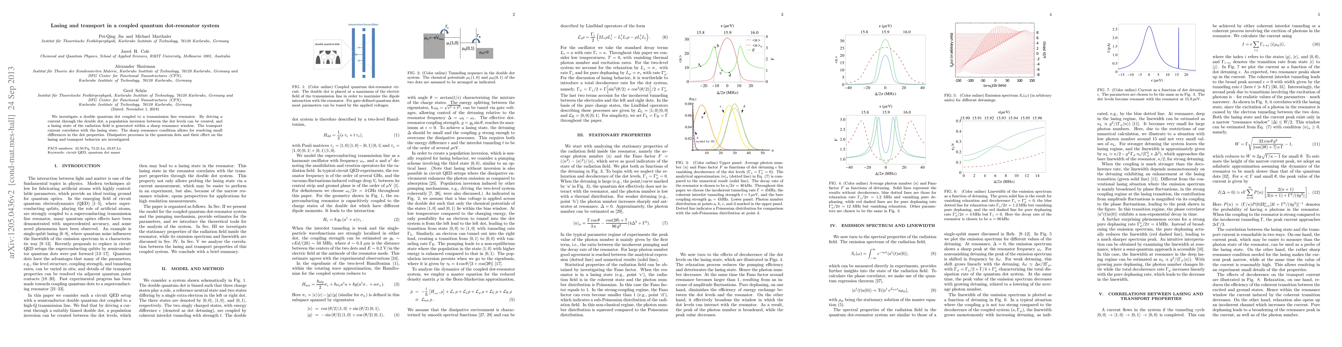 This paper explores a coupled quantum dot-resonator system where a current-driven population inversion generates a lasing state within a sharp resonance window, correlating transport current with lasing. The study also examines the impact of dissipative processes on lasing and transport dynamics.