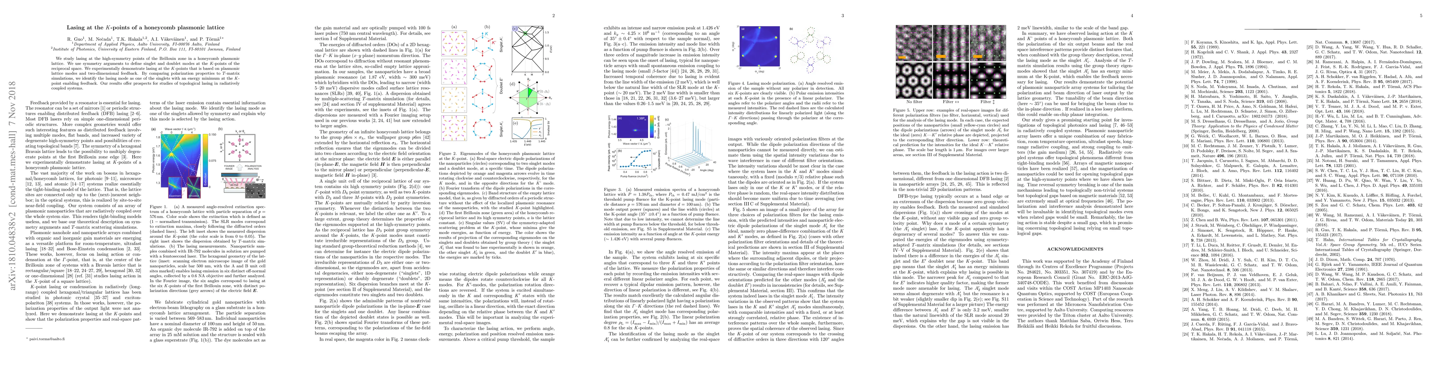 This paper investigates lasing phenomena at the $\Kp$-points in a honeycomb plasmonic lattice, identifying singlet and doublet modes via symmetry arguments and experimental validation. The study demonstrates lasing based on lattice modes with two-dimensional feedback, confirming the lasing mode through polarization analysis and simulations, which opens avenues for topological lasing research.