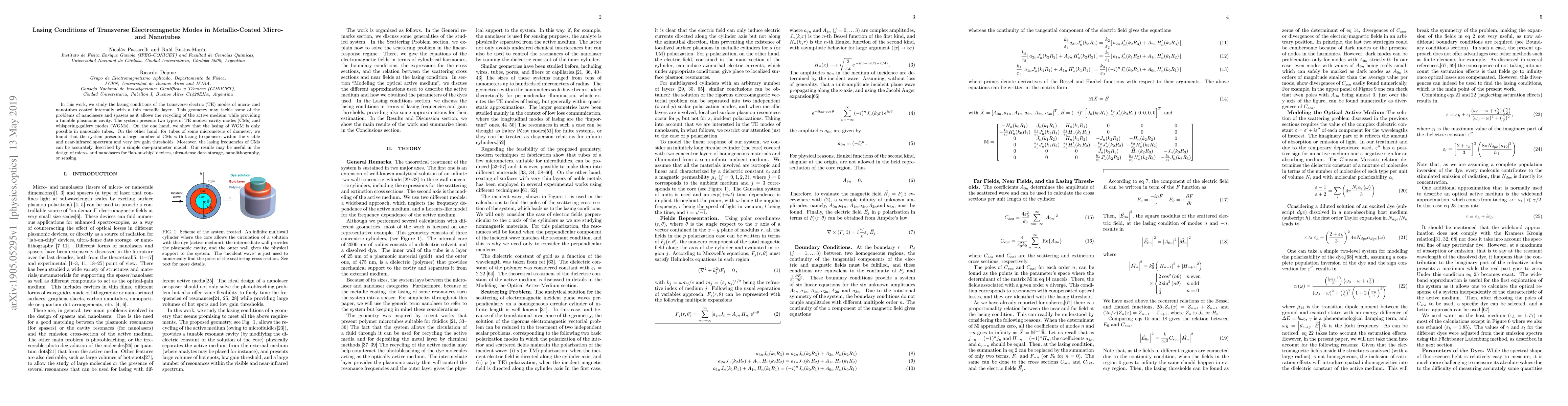 In this work, we study the lasing conditions of the transverse electric (TE) modes of micro- and nanotubes coated internally with a thin metallic layer. This geometry may tackle some of the problems of nanolasers and spasers as it allows the recycling of the active medium while providing a tunable plasmonic cavity. The system presents two types of TE modes: cavity modes (CMs) and whispering-gallery modes (WGMs). On the one hand, we show that the lasing of WGM is only possible in nanoscale tubes. On the other hand, for tubes of some micrometers of diameter, we found that the system presents a large number of CMs with lasing frequencies within the visible and near-infrared spectrum and very low gain thresholds. Moreover, the lasing frequencies of CMs can be accurately described by a simple one-parameter model. Our results may be useful in the design of micro- and nanolasers for `lab-on-chip' devices, ultra-dense data storage, nanolithography, or sensing.