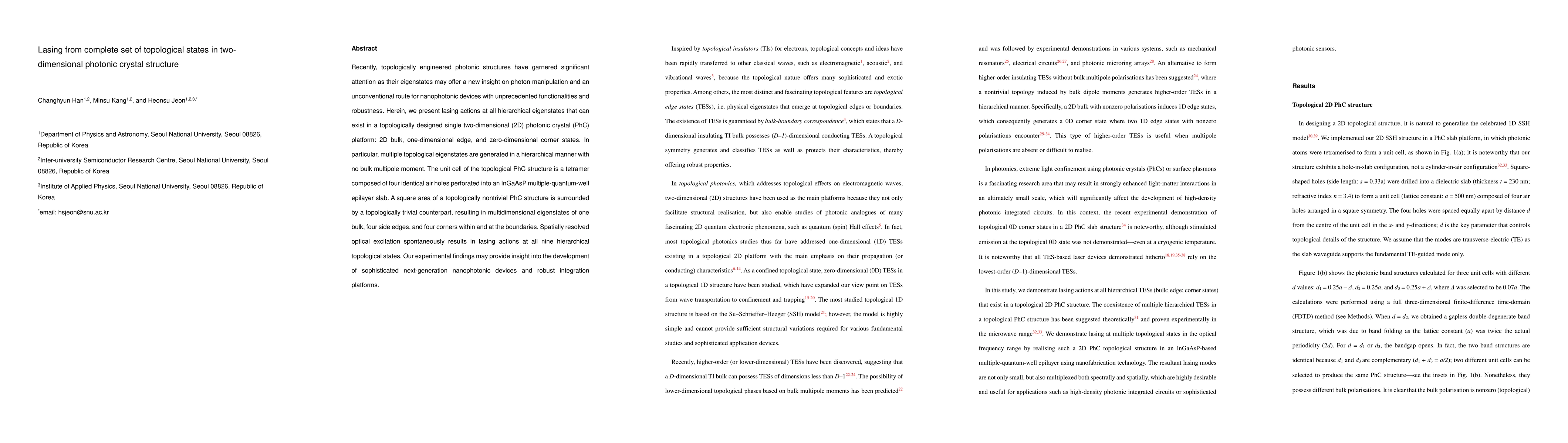 Recently, topologically engineered photonic structures have garnered significant attention as their eigenstates may offer a new insight on photon manipulation and an unconventional route for nanophotonic devices with unprecedented functionalities and robustness. Herein, we present lasing actions at all hierarchical eigenstates that can exist in a topologically designed single two-dimensional (2D) photonic crystal (PhC) platform: 2D bulk, one-dimensional edge, and zero-dimensional corner states. In particular, multiple topological eigenstates are generated in a hierarchical manner with no bulk multipole moment. The unit cell of the topological PhC structure is a tetramer composed of four identical air holes perforated into an InGaAsP multiple-quantum-well epilayer slab. A square area of a topologically nontrivial PhC structure is surrounded by a topologically trivial counterpart, resulting in multidimensional eigenstates of one bulk, four side edges, and four corners within and at the boundaries. Spatially resolved optical excitation spontaneously results in lasing actions at all nine hierarchical topological states. Our experimental findings may provide insight into the development of sophisticated next-generation nanophotonic devices and robust integration platforms.