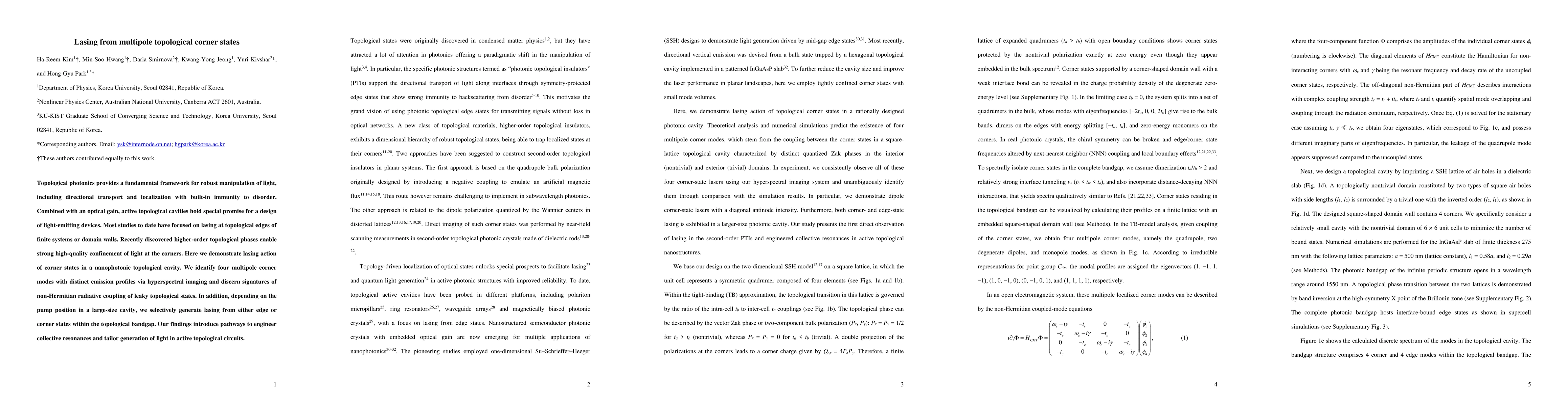 The paper demonstrates lasing from topological corner states in a nanophotonic cavity, identifying four multipole modes with distinct emissions. It shows selective lasing from edges or corners based on pump position, highlighting the potential for engineering light generation in active topological circuits.
