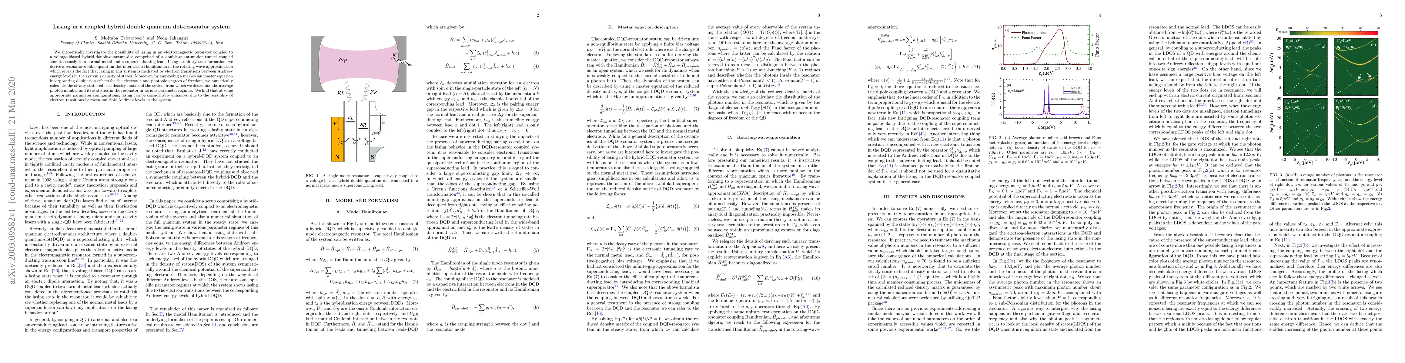 This paper explores the theoretical potential for lasing in a hybrid double quantum dot-resonator system, demonstrating that lasing is mediated by electron transitions between Andreev energy levels. Numerical simulations reveal that lasing can be significantly enhanced under specific parameter configurations due to transitions between multiple Andreev levels.