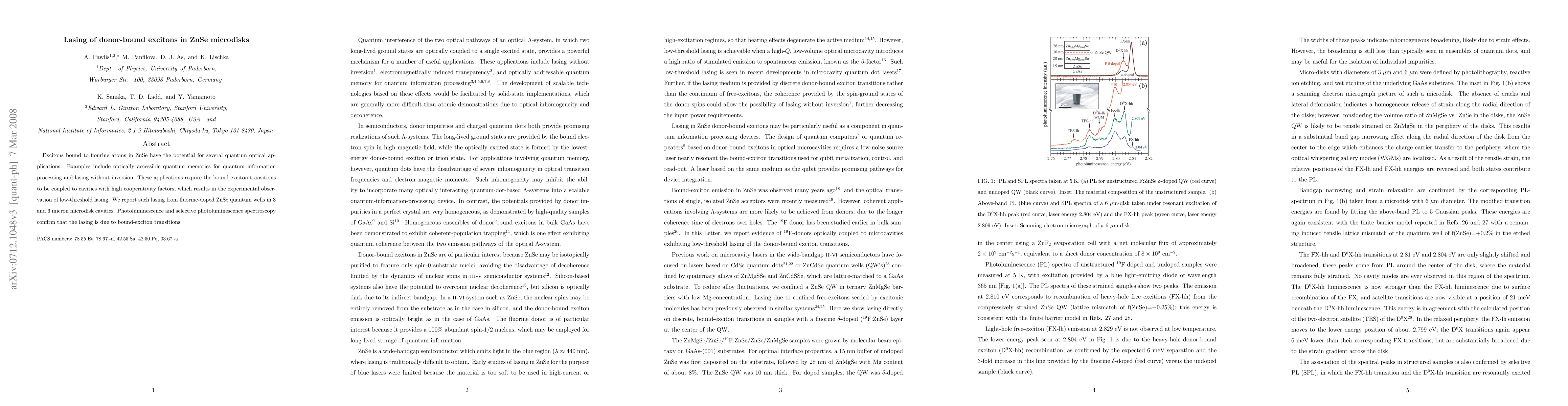 This paper reports low-threshold lasing from fluorine-doped ZnSe quantum wells in microdisk cavities, demonstrating the potential for quantum optical applications such as quantum memories and lasing without inversion. Photoluminescence and spectroscopy confirm lasing is due to excitons bound to fluorine atoms.