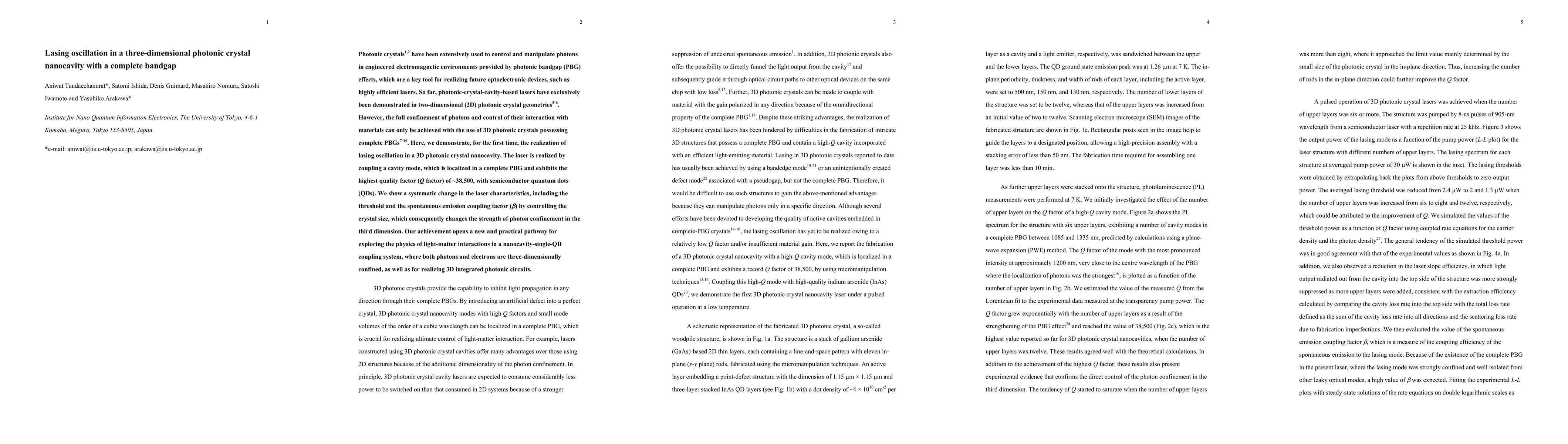 This paper demonstrates lasing in a three-dimensional photonic crystal nanocavity with a complete bandgap, achieving a high quality factor of ~38,500 by coupling with semiconductor quantum dots. It explores how laser characteristics can be modified by adjusting the crystal size to vary photon confinement, paving the way for advanced photonic devices.