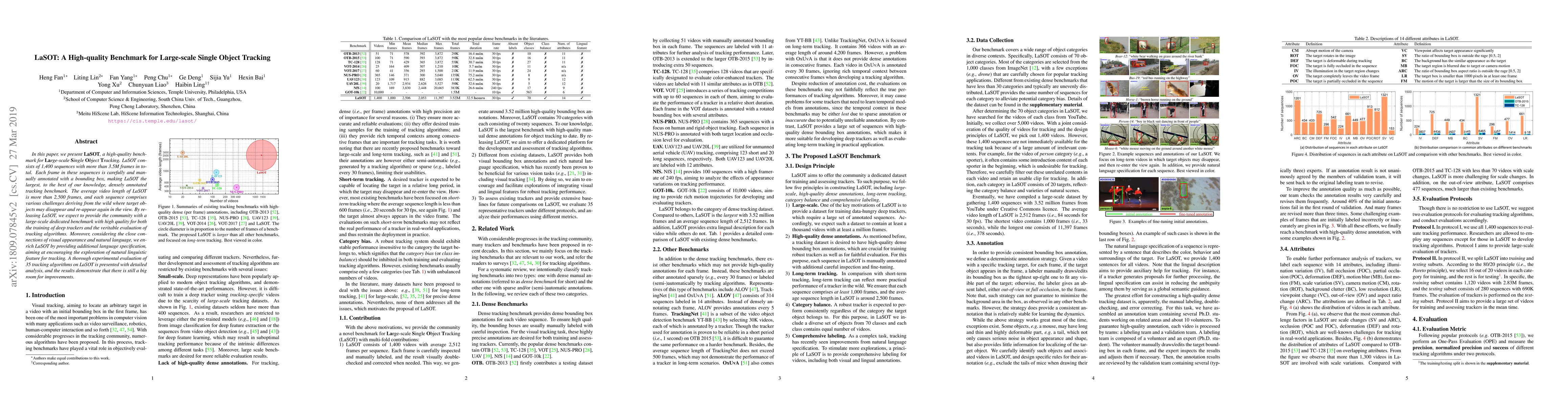 LaSOT is a high-quality benchmark for large-scale single object tracking, featuring 1,400 sequences with over 3.5M frames, densely annotated and enriched with language specifications. The benchmark aims to advance deep tracker training and evaluation, revealing substantial room for improvement in current algorithms.