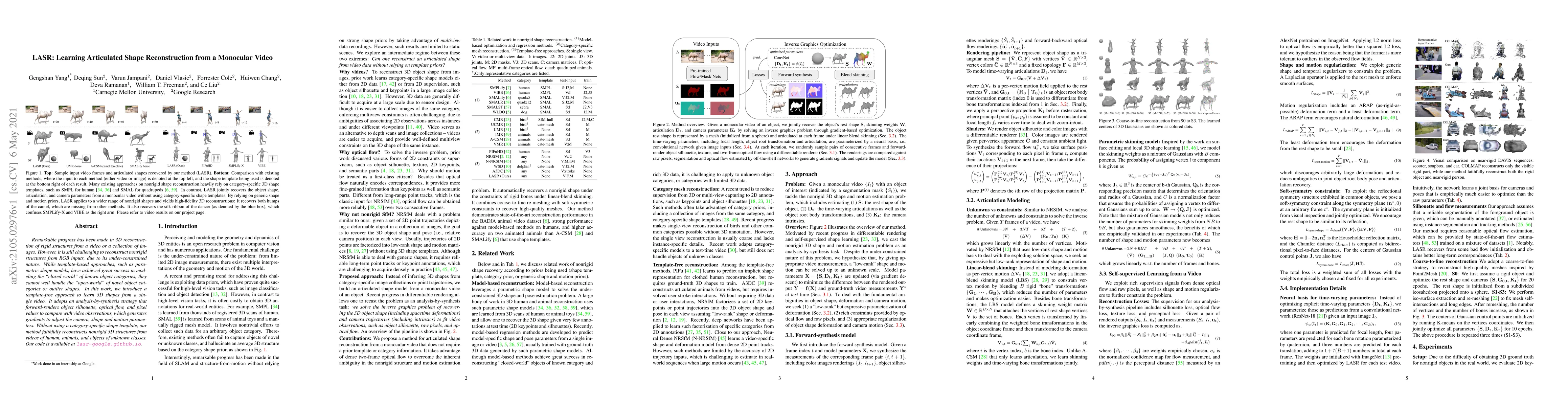 Remarkable progress has been made in 3D reconstruction of rigid structures from a video or a collection of images. However, it is still challenging to reconstruct nonrigid structures from RGB inputs, due to its under-constrained nature. While template-based approaches, such as parametric shape models, have achieved great success in modeling the "closed world" of known object categories, they cannot well handle the "open-world" of novel object categories or outlier shapes. In this work, we introduce a template-free approach to learn 3D shapes from a single video. It adopts an analysis-by-synthesis strategy that forward-renders object silhouette, optical flow, and pixel values to compare with video observations, which generates gradients to adjust the camera, shape and motion parameters. Without using a category-specific shape template, our method faithfully reconstructs nonrigid 3D structures from videos of human, animals, and objects of unknown classes. Code will be available at lasr-google.github.io .