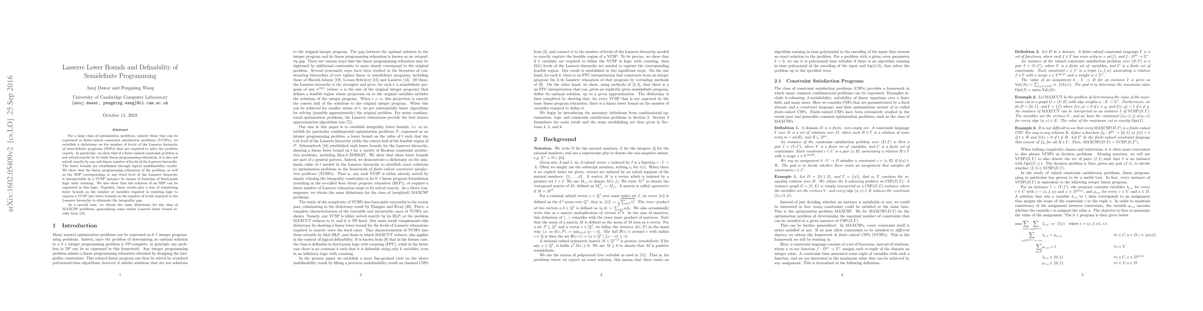 For a large class of optimization problems, namely those that can be expressed as finite-valued constraint satisfaction problems (VCSPs), we establish a dichotomy on the number of levels of the Lasserre hierarchy of semi-definite programs (SDPs) that are required to solve the problem exactly. In particular, we show that if a finite-valued constraint problem is not solved exactly by its basic linear programming relaxation, it is also not solved exactly by any sub-linear number of levels of the Lasserre hierarchy. The lower bounds are established through logical undefinability results. We show that the linear programming relaxation of the problem, as well as the SDP corresponding to any fixed level of the Lasserre hierarchy is interpretable in a VCSP instance by means of formulas of fixed-point logic with counting. We also show that the solution of an SDP can be expressed in this logic. Together, these results give a way of translating lower bounds on the number of variables required in counting logic to express a VCSP into lower bounds on the number of levels required in the Lasserre hierarchy to eliminate the integrality gap. As a special case, we obtain the same dichotomy for the class of MAXCSP problems, generalizing some earlier Lasserre lower bound results of Schoenebeck.