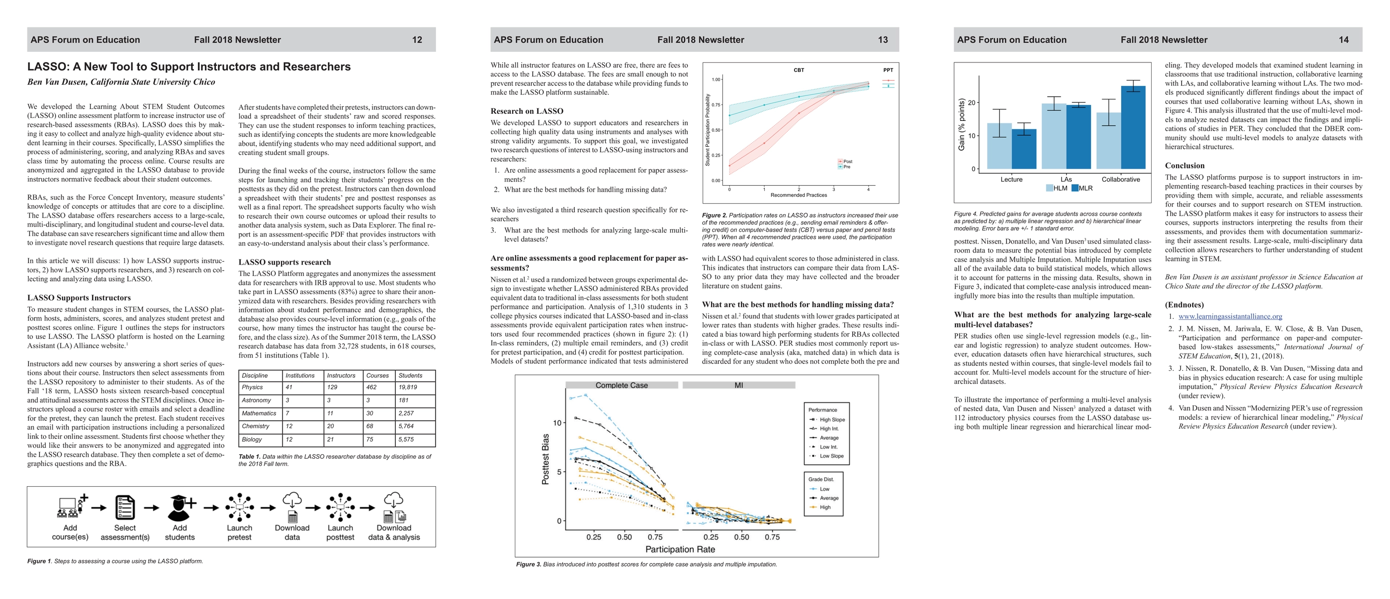 We developed the Learning About STEM Student Outcomes (LASSO) online assessment platform to increase instructor use of research-based assessments (RBAs). LASSO does this by making it easy to collect and analyze high-quality evidence about student learning in their courses. Specifically, LASSO simplifies the process of administering, scoring, and analyzing RBAs and saves class time by automating the process online. Course results are anonymized and aggregated in the LASSO database to provide instructors normative feedback about their student outcomes.