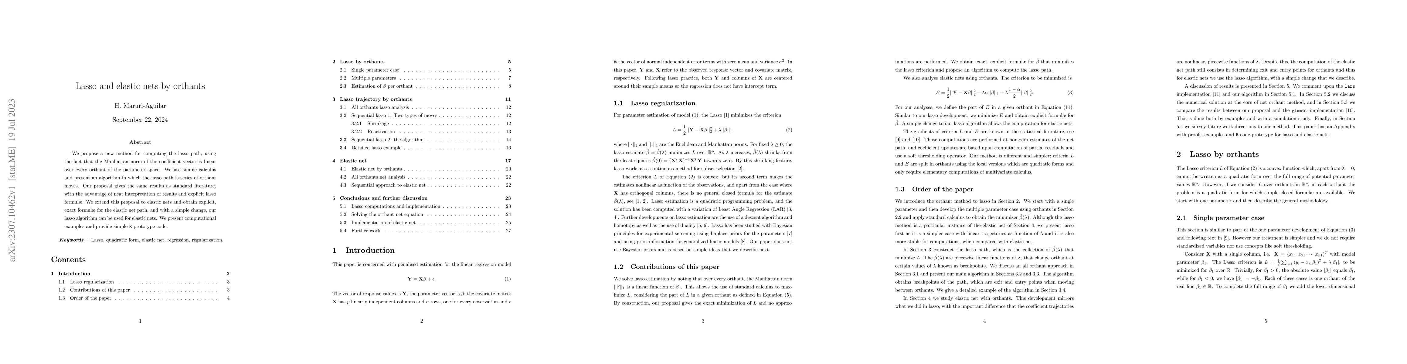 This paper introduces a new method for computing the lasso path by leveraging the linearity of the Manhattan norm in orthant regions, offering a series of orthant moves. It extends the approach to elastic nets, providing explicit formulas and computational examples, with accompanying R code.