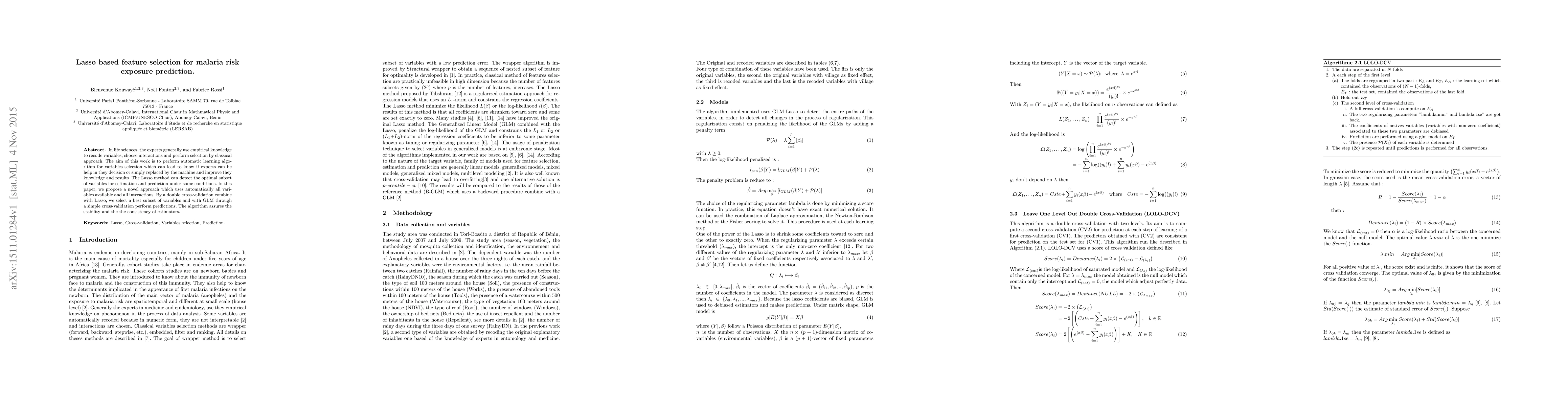 A novel Lasso-based approach is proposed for automatically selecting variables in malaria risk exposure prediction models, aiming to reduce human expertise reliance and improve results.