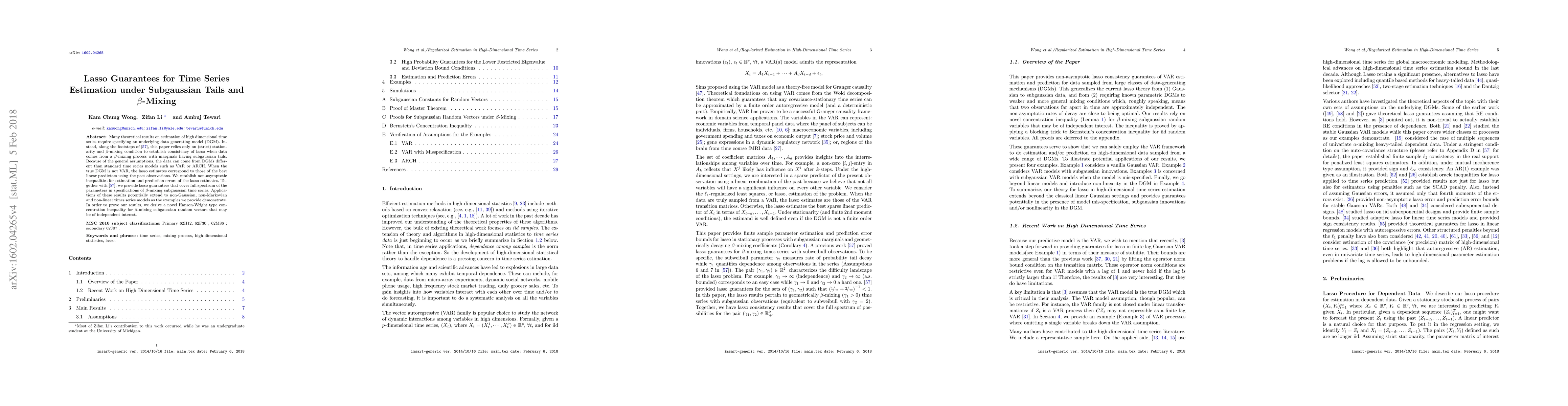 Many theoretical results on estimation of high dimensional time series require specifying an underlying data generating model (DGM). Instead, along the footsteps of~\cite{wong2017lasso}, this paper relies only on (strict) stationarity and $ \beta $-mixing condition to establish consistency of lasso when data comes from a $\beta$-mixing process with marginals having subgaussian tails. Because of the general assumptions, the data can come from DGMs different than standard time series models such as VAR or ARCH. When the true DGM is not VAR, the lasso estimates correspond to those of the best linear predictors using the past observations. We establish non-asymptotic inequalities for estimation and prediction errors of the lasso estimates. Together with~\cite{wong2017lasso}, we provide lasso guarantees that cover full spectrum of the parameters in specifications of $ \beta $-mixing subgaussian time series. Applications of these results potentially extend to non-Gaussian, non-Markovian and non-linear times series models as the examples we provide demonstrate. In order to prove our results, we derive a novel Hanson-Wright type concentration inequality for $\beta$-mixing subgaussian random vectors that may be of independent interest.