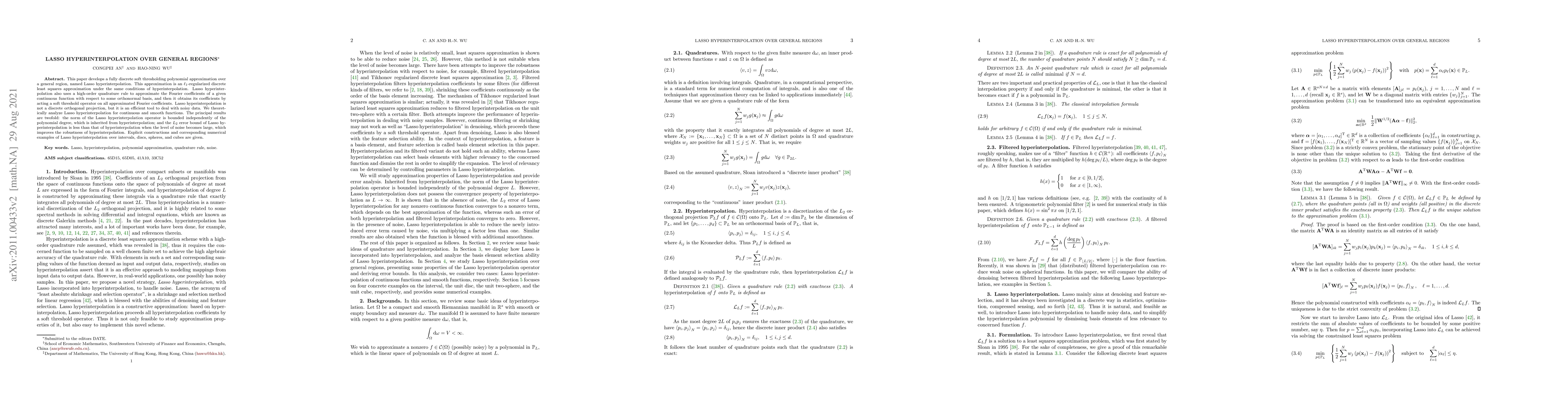 This paper introduces Lasso hyperinterpolation, an $\ell_1$-regularized polynomial approximation method for noisy data over general regions, which maintains robustness and efficiency. It achieves better $L_2$ error bounds than hyperinterpolation in noisy conditions, with theoretical analysis and numerical examples provided.