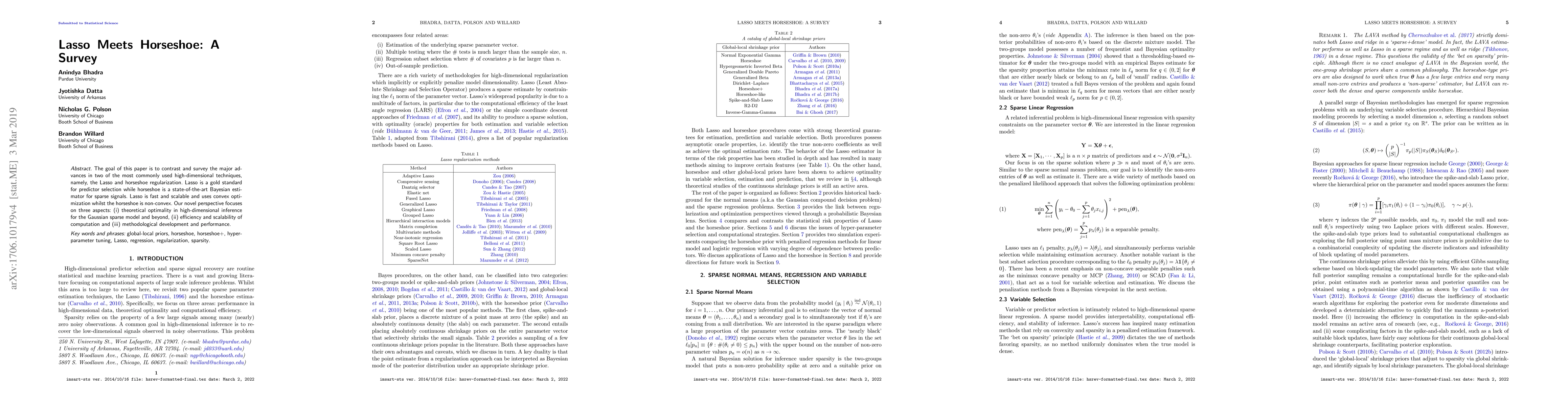 The goal of this paper is to contrast and survey the major advances in two of the most commonly used high-dimensional techniques, namely, the Lasso and horseshoe regularization. Lasso is a gold standard for predictor selection while horseshoe is a state-of-the-art Bayesian estimator for sparse signals. Lasso is fast and scalable and uses convex optimization whilst the horseshoe is non-convex. Our novel perspective focuses on three aspects: (i) theoretical optimality in high dimensional inference for the Gaussian sparse model and beyond, (ii) efficiency and scalability of computation and (iii) methodological development and performance.
