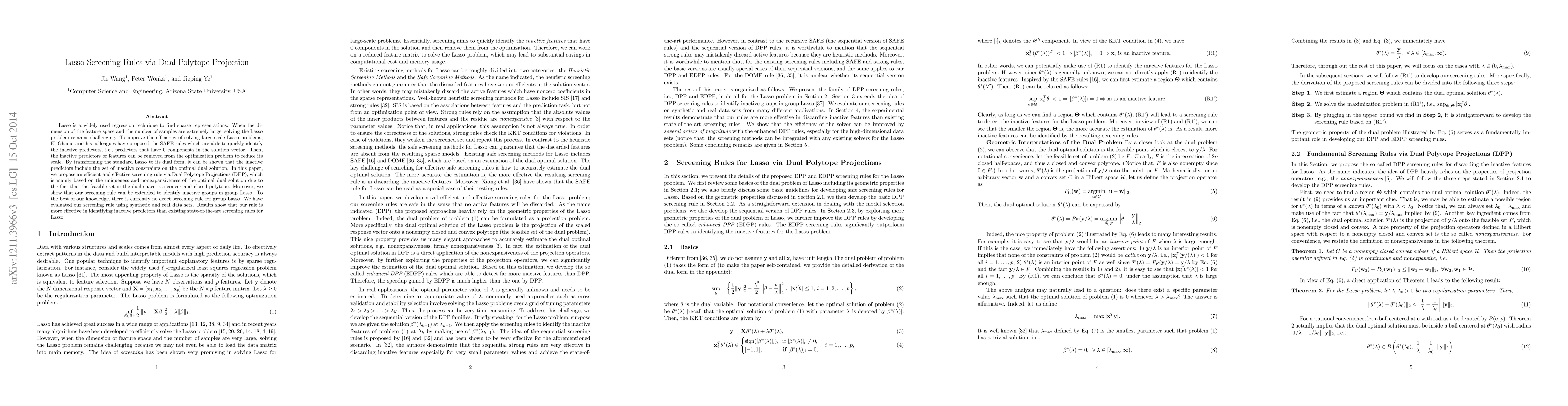 This paper proposes a Dual Polytope Projection (DPP) screening rule for efficiently identifying inactive predictors in large-scale Lasso problems, leveraging the convex and closed nature of the dual feasible set. The method is also extended to group Lasso, where it outperforms existing screening rules in identifying inactive predictors.