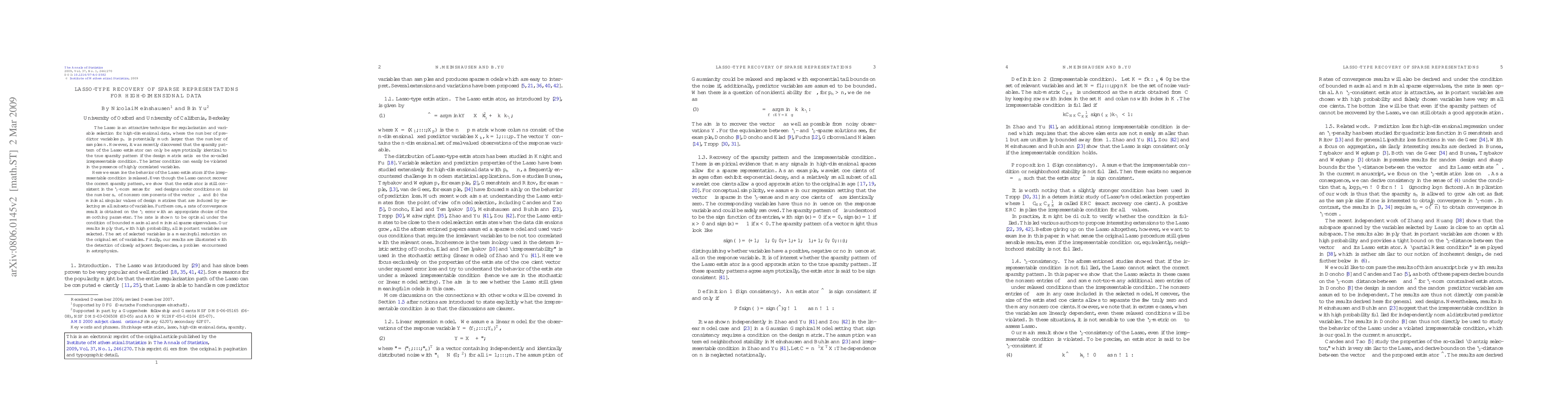 The Lasso is an attractive technique for regularization and variable selection for high-dimensional data, where the number of predictor variables $p_n$ is potentially much larger than the number of samples $n$. However, it was recently discovered that the sparsity pattern of the Lasso estimator can only be asymptotically identical to the true sparsity pattern if the design matrix satisfies the so-called irrepresentable condition. The latter condition can easily be violated in the presence of highly correlated variables. Here we examine the behavior of the Lasso estimators if the irrepresentable condition is relaxed. Even though the Lasso cannot recover the correct sparsity pattern, we show that the estimator is still consistent in the $\ell_2$-norm sense for fixed designs under conditions on (a) the number $s_n$ of nonzero components of the vector $\beta_n$ and (b) the minimal singular values of design matrices that are induced by selecting small subsets of variables. Furthermore, a rate of convergence result is obtained on the $\ell_2$ error with an appropriate choice of the smoothing parameter. The rate is shown to be optimal under the condition of bounded maximal and minimal sparse eigenvalues. Our results imply that, with high probability, all important variables are selected. The set of selected variables is a meaningful reduction on the original set of variables. Finally, our results are illustrated with the detection of closely adjacent frequencies, a problem encountered in astrophysics.