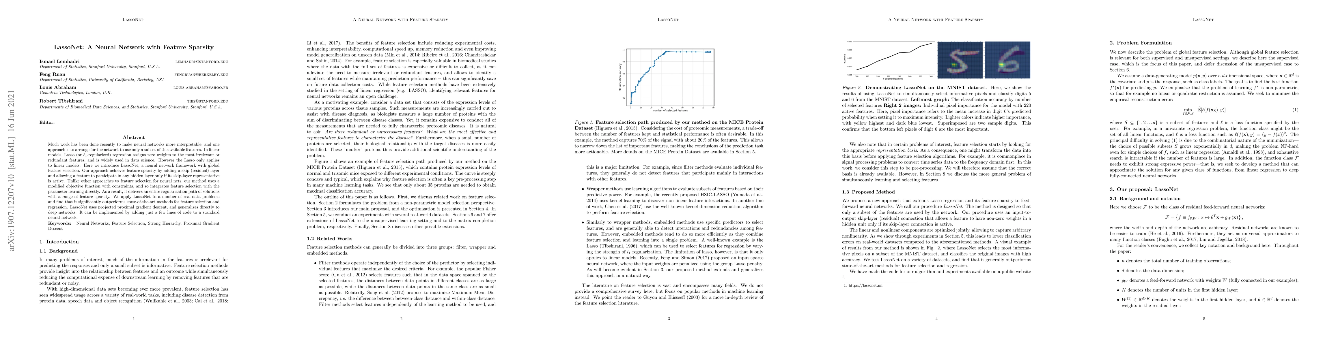 LassoNet introduces a neural network framework with global feature selection by enforcing sparsity through a modified objective function. This method integrates feature selection directly into parameter learning, delivering a regularization path of solutions with varying feature sparsity, and significantly outperforms existing methods in systematic experiments.