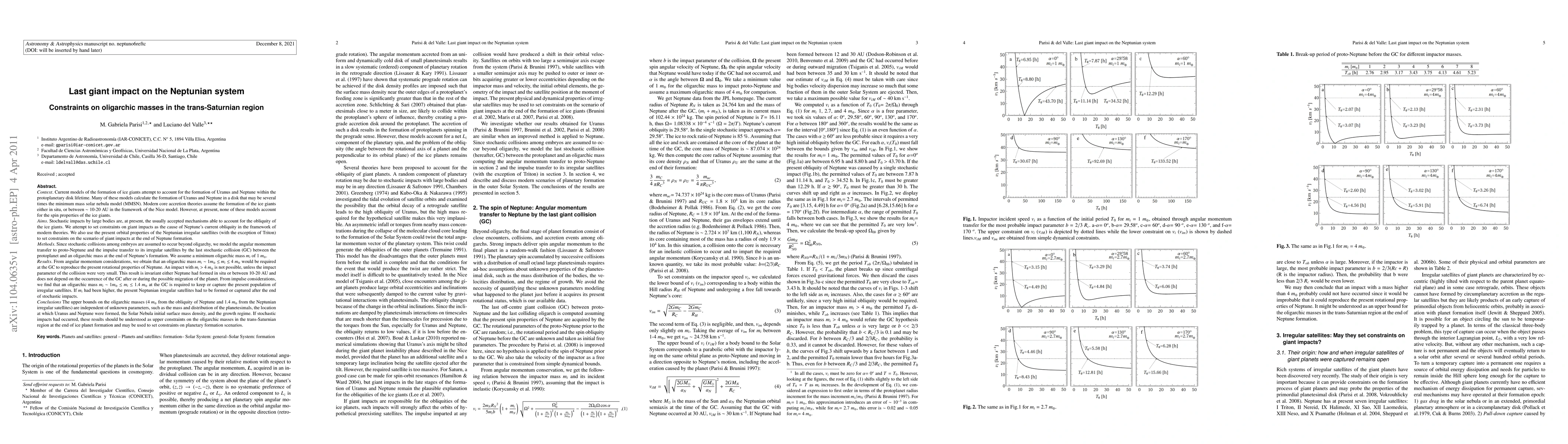 Stochastic impacts by large bodies are, at present, the usually accepted mechanisms able to account for the obliquity of the ice giants. We attempt to set constraints on giant impacts as the cause of Neptune's current obliquity in the framework of modern theories. We also use the present orbital properties of the Neptunian irregular satellites (with the exception of Triton) to set constraints on the scenario of giant impacts at the end of Neptune formation. We model the angular momentum transfer to proto-Neptune and the impulse transfer to its irregular satellites by the last stochastic collision (GC) between the protoplanet and an oligarchic mass at the end of Neptune's formation. We obtain that an impactor mass greather than 4 Earth masses is not possible since it cannot reproduce the present rotational properties of the planet, unless the impact parameter of the collision were very small. On the other hand, if the impactor mass was greather than 1.4 Earth masses, the present Neptunian irregular satellites had to be formed or captured after the end of stochastic impacts. The upper bounds on the oligarchic masses (4 Earth masses from the obliquity of Neptune and 1.4 earth masses from the Neptunian irregular satellites) are independent of unknown parameters, such as the mass and distribution of the planetesimals, the location at which Uranus and Neptune were formed, the Solar Nebula initial surface mass density, and the growth regime. If stochastic impacts had occurred, these results should be understood as upper constraints on the oligarchic masses in the trans-Saturnian region at the end of ice planet formation and may be used to set constraints on planetary formation scenarios.