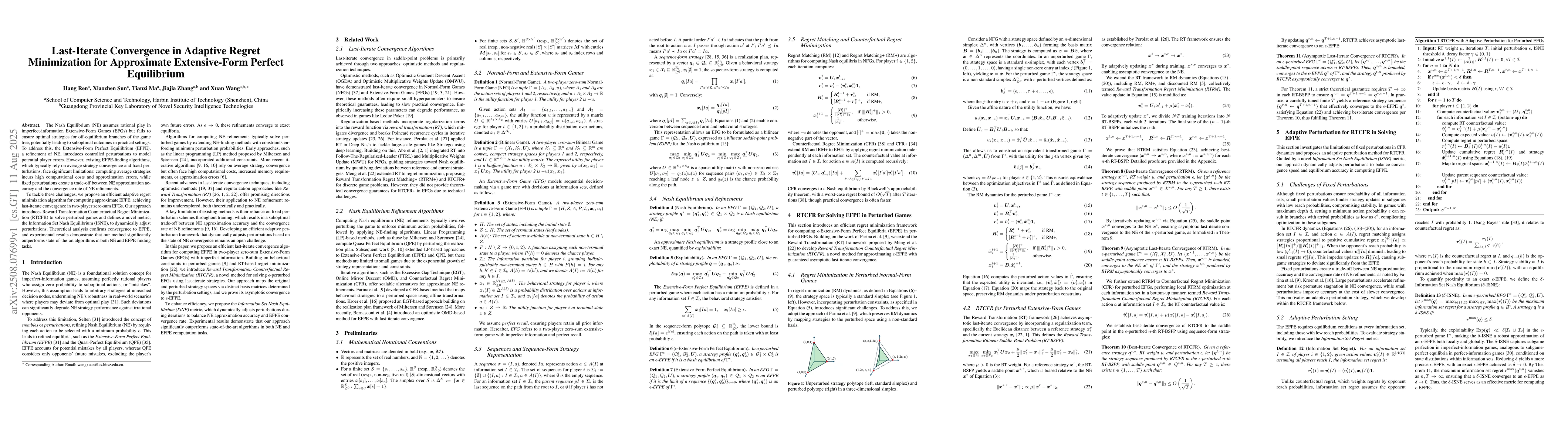 The paper introduces Reward Transformation Counterfactual Regret Minimization (RTCFR) with adaptive perturbations guided by the Information Set Nash Equilibrium (ISNE) metric, which achieves last-iterate convergence to an ϵ-EFPE in two-player zero-sum EFGs.