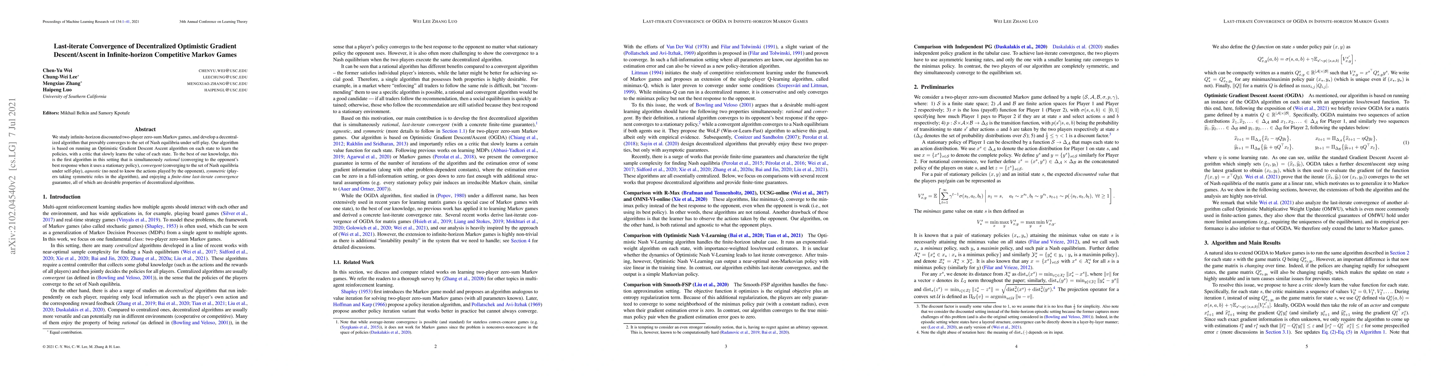 This paper introduces a decentralized algorithm for infinite-horizon competitive Markov games that converges to Nash equilibria under self-play. The algorithm leverages an Optimistic Gradient Descent Ascent method, ensuring it is rational, convergent, agnostic, symmetric, and provides a finite-time last-iterate convergence guarantee.