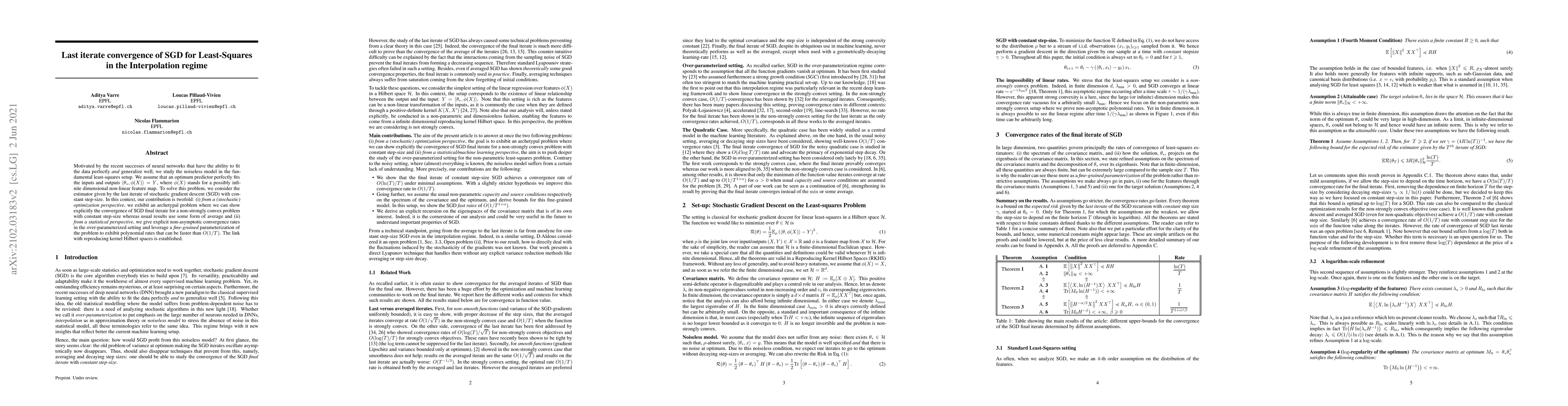 This paper investigates the convergence of the last iterate of SGD in the least-squares interpolation regime, demonstrating explicit convergence for a non-strongly convex problem with constant step-size. It also provides non-asymptotic convergence rates in over-parameterized settings, showing polynomial rates potentially faster than $O(1/T)$.
