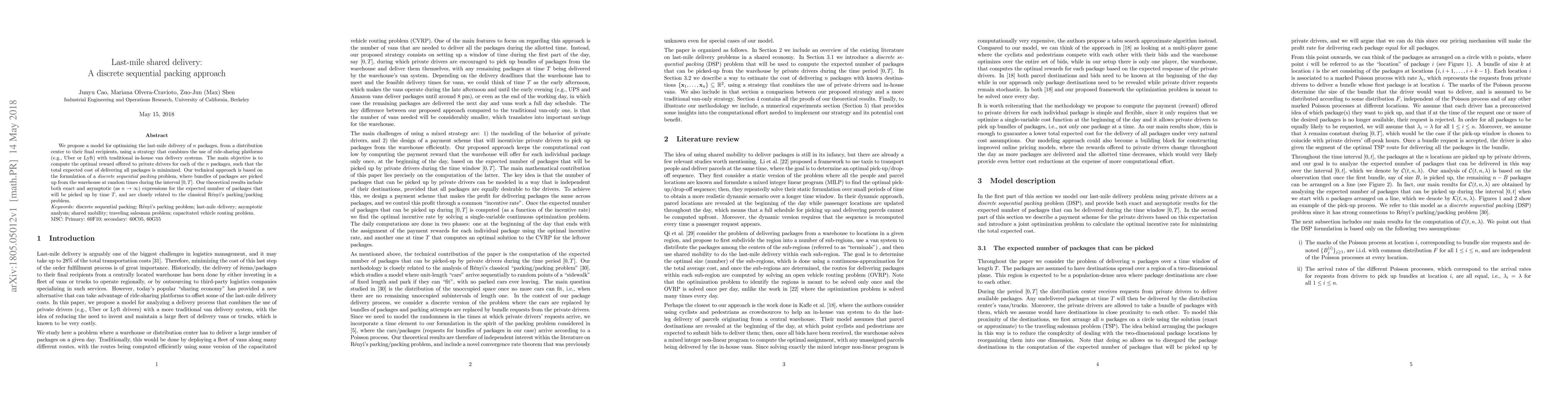 We propose a model for optimizing the last-mile delivery of n packages, from a distribution center to their final recipients, using a strategy that combines the use of ride-sharing platforms (e.g., Uber or Lyft) with traditional in-house van delivery systems. The main objective is to compute the optimal reward offered to private drivers for each of the n packages, such that the total expected cost of delivering all packages is minimized. Our technical approach is based on the formulation of a discrete sequential packing problem, where bundles of packages are picked up from the warehouse at random times during the interval [0, T]. Our theoretical results include both exact and asymptotic (as $n \to \infty$) expressions for the expected number of packages that will be picked up by time T, and are closely related to the classical Renyi's parking/packing problem.
