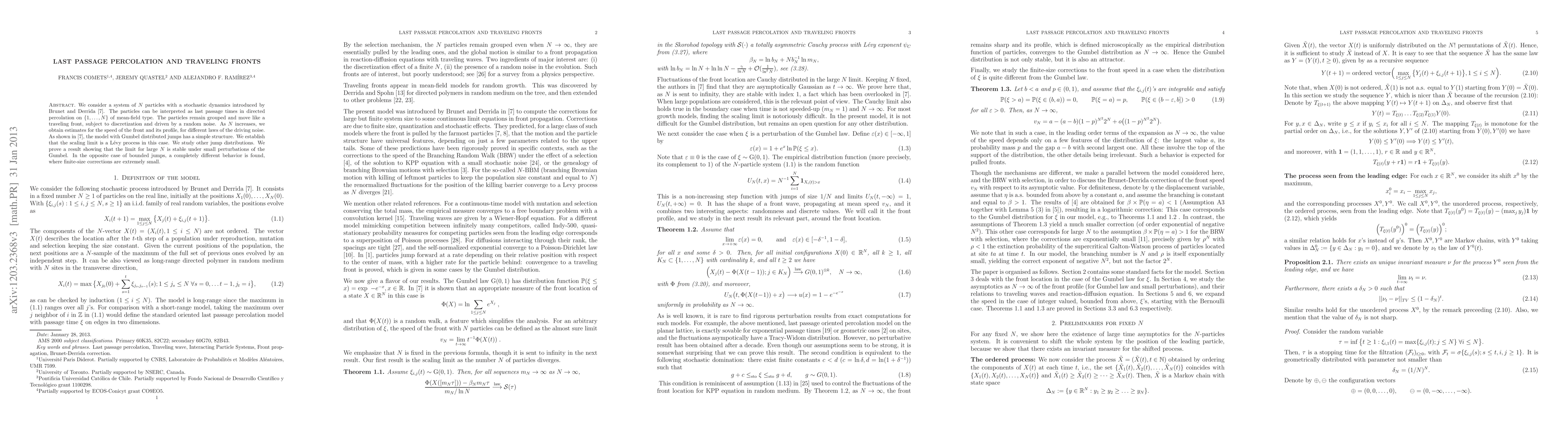 Researchers study how particles move like a traveling wave in a system with random noise, finding that the speed of the front increases as the number of particles grows, and the Gumbel distribution plays a key role.