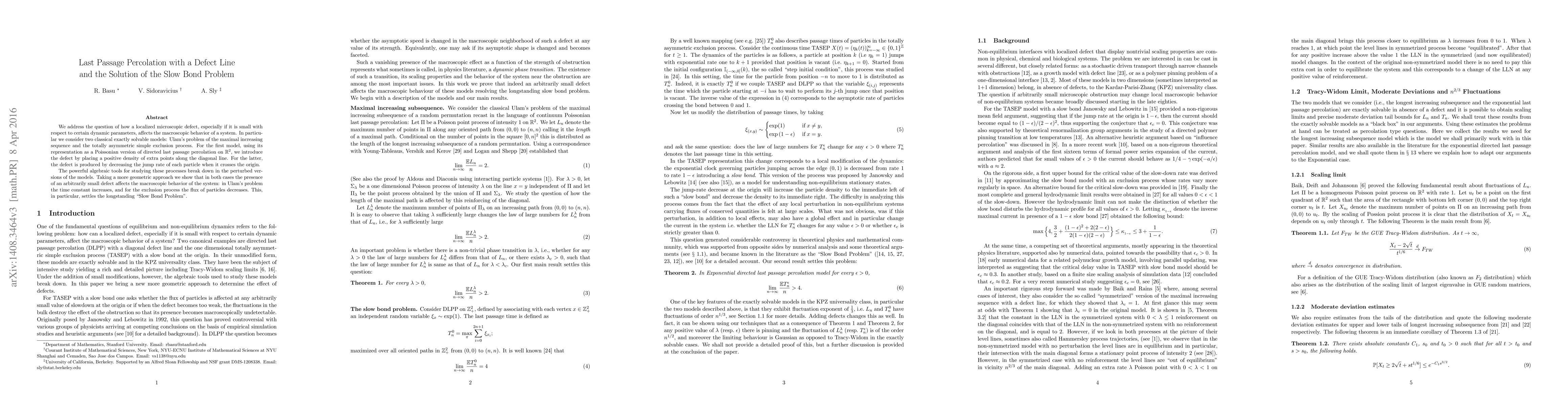 We address the question of how a localized microscopic defect, especially if it is small with respect to certain dynamic parameters, affects the macroscopic behavior of a system. In particular we consider two classical exactly solvable models: Ulam's problem of the maximal increasing sequence and the totally asymmetric simple exclusion process. For the first model, using its representation as a Poissonian version of directed last passage percolation on $\mathbb R^2$, we introduce the defect by placing a positive density of extra points along the diagonal line. For the latter, the defect is produced by decreasing the jump rate of each particle when it crosses the origin. The powerful algebraic tools for studying these processes break down in the perturbed versions of the models. Taking a more geometric approach we show that in both cases the presence of an arbitrarily small defect affects the macroscopic behavior of the system: in Ulam's problem the time constant increases, and for the exclusion process the flux of particles decreases. This, in particular, settles the longstanding Slow Bond Problem.