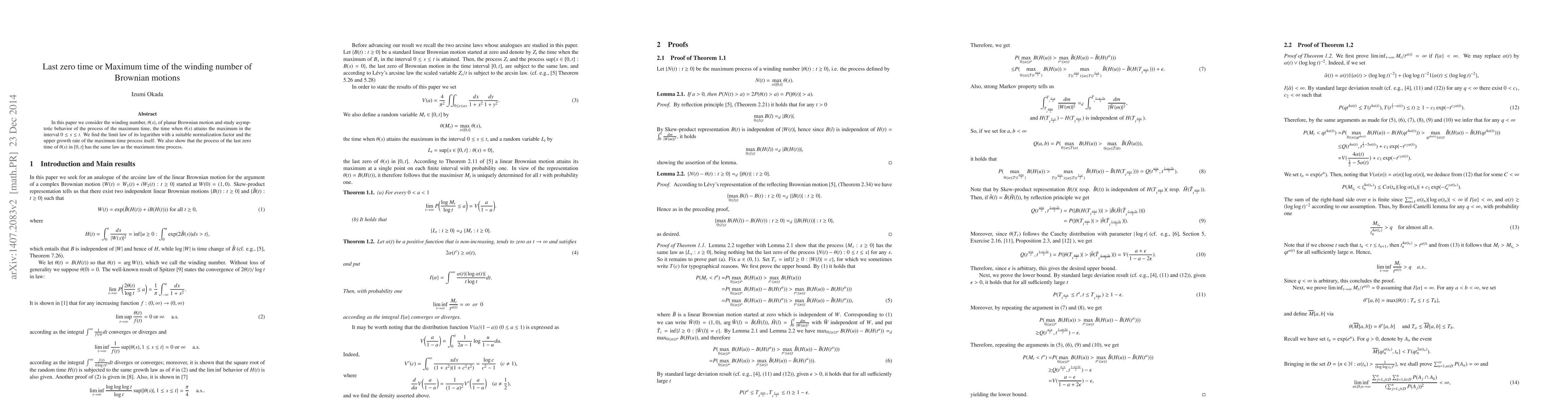 In this paper we consider the winding number, $\theta(s)$, of planar Brownian motion and study asymptotic behavior of the process of the maximum time, the time when $\theta(s)$ attains the maximum in the interval $0\le s \le t$. We find the limit law of its logarithm with a suitable normalization factor and the upper growth rate of the maximum time process itself. We also show that the process of the last zero time of $\theta(s)$ in $[0,t]$ has the same law as the maximum time process.