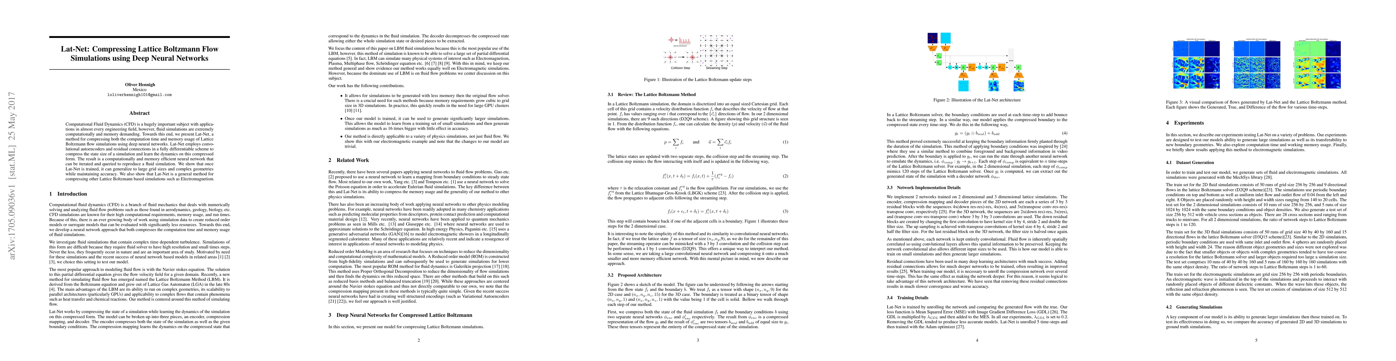 Computational Fluid Dynamics (CFD) is a hugely important subject with applications in almost every engineering field, however, fluid simulations are extremely computationally and memory demanding. Towards this end, we present Lat-Net, a method for compressing both the computation time and memory usage of Lattice Boltzmann flow simulations using deep neural networks. Lat-Net employs convolutional autoencoders and residual connections in a fully differentiable scheme to compress the state size of a simulation and learn the dynamics on this compressed form. The result is a computationally and memory efficient neural network that can be iterated and queried to reproduce a fluid simulation. We show that once Lat-Net is trained, it can generalize to large grid sizes and complex geometries while maintaining accuracy. We also show that Lat-Net is a general method for compressing other Lattice Boltzmann based simulations such as Electromagnetism.