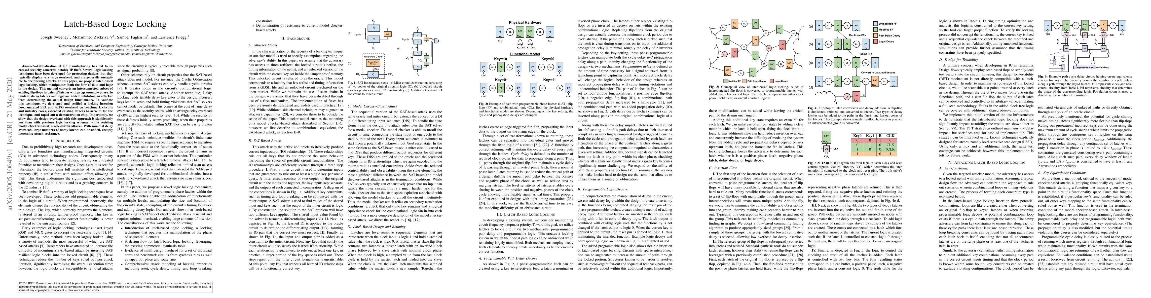 This paper proposes a latch-based logic locking technique to protect IC designs against IP theft, featuring lower overhead and enhanced resistance to attacks compared to previous methods. The approach converts flip-flops into latches and adds decoy elements, validated through analysis and a demonstration chip.