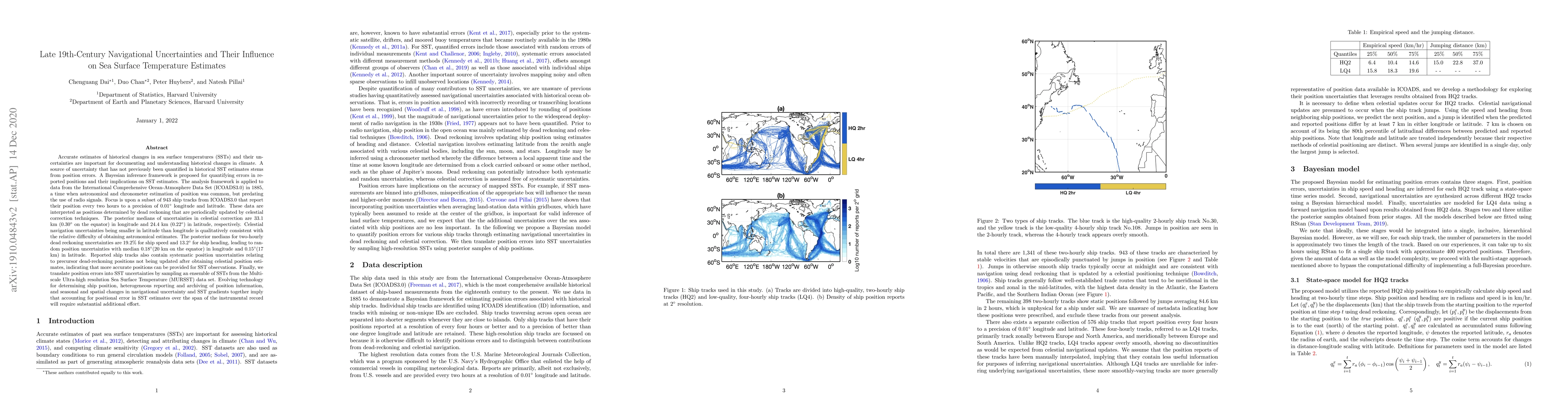 Accurate estimates of historical changes in sea surface temperatures (SSTs) and their uncertainties are important for documenting and understanding historical changes in climate. A source of uncertainty that has not previously been quantified in historical SST estimates stems from position errors. A Bayesian inference framework is proposed for quantifying errors in reported positions and their implications on SST estimates. The analysis framework is applied to data from the International Comprehensive Ocean-Atmosphere Data Set (ICOADS3.0) in 1885, a time when astronomical and chronometer estimation of position was common, but predating the use of radio signals. Focus is upon a subset of 943 ship tracks from ICOADS3.0 that report their position every two hours to a precision of 0.01{\deg} longitude and latitude. These data are interpreted as positions determined by dead reckoning that are periodically updated by celestial correction techniques. The posterior medians of uncertainties in celestial correction are 33.1 km (0.30{\deg} on the equator) in longitude and 24.4 km (0.22{\deg}) in latitude, respectively. The posterior medians of two-hourly dead reckoning uncertainties are 19.2% for ship speed and 13.2{\deg} for ship heading, leading to random position uncertainties with median 0.18{\deg} (20 km on the equator) in longitude and 0.15{\deg} (17 km) in latitude. Reported ship tracks also contain systematic position uncertainties relating to precursor dead-reckoning positions not being updated after obtaining celestial position estimates, indicating that more accurate positions can be provided for SST observations. Finally, we translate position errors into SST uncertainties by sampling an ensemble of SSTs from the Multi-scale Ultra-high resolution Sea Surface Temperature (MURSST) data set.