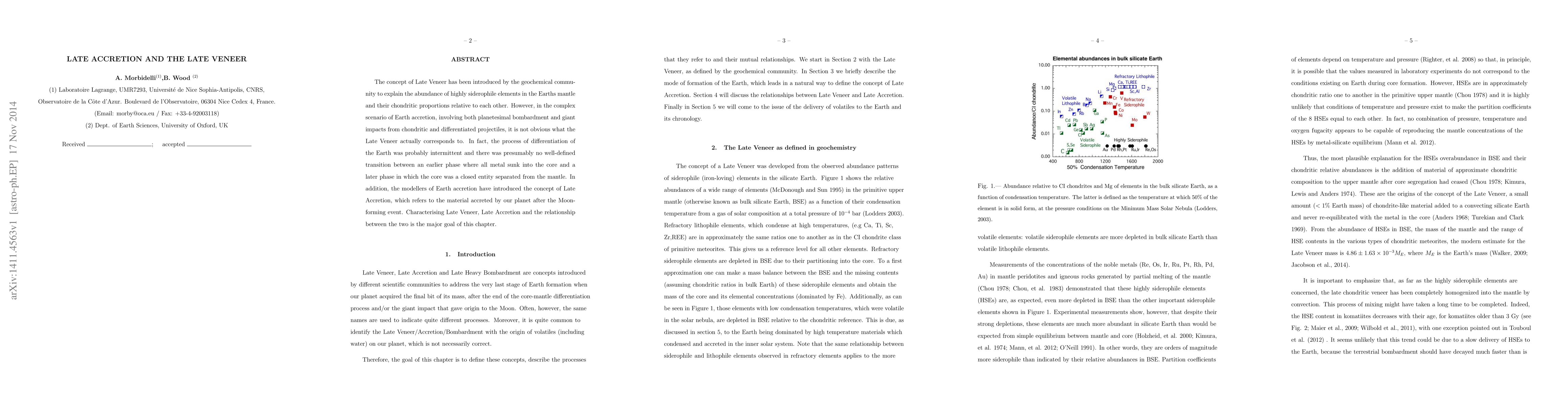 This paper explores the concepts of Late Veneer and Late Accretion to explain the presence of siderophile elements in Earth's mantle, questioning the clear distinction between these phases during Earth's complex accretion history involving varied impacts and differentiation processes. The study aims to characterize these processes and their relationship.