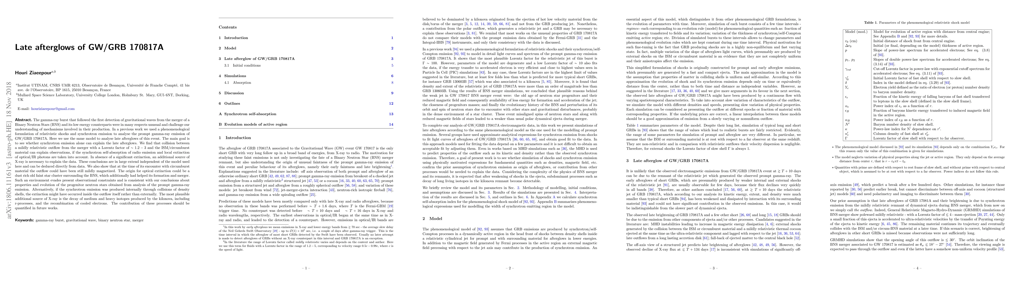 The gamma-ray burst that followed the first detection of gravitational waves from the merger of a Binary Neutron Stars and its low energy counterparts were in many respects unusual and challenge our understanding of mechanisms involved in their production. In a previous work we used a phenomenological formulation of relativistic shocks and synchrotron emission to analyse the prompt gamma-ray emission of GW/GRB 170817A. Here we use the same model to analyse late afterglows of this event. The main goal is to see whether synchrotron emission alone can explain late afterglows. We find that collision between a mildly relativistic outflow from the merger with a Lorentz factor of $\sim 1.2-3$ and the ISM/circumburst material can explain observations, if the synchrotron self-absorption of radio emission and extinction of optical/IR photons are taken into account. Alternatively, an additional source of X-ray is necessary to explain the data. These conclusions are independent of the model used here and can be deduced directly from data. We also show that at the time of its encounter with circumburst material the outflow could have been still mildly magnetized. The origin for optical extinction could be a dust rich old faint star cluster surrounding the BNS, which had also helped its formation and merger. Such environment evades present observational constraints and is consistent with our conclusions about properties and evolution of the progenitor neutron stars obtained from the prompt gamma-ray. If the synchrotron emission was produced by collision between density shells, the extinction might have occurred inside the outflow itself rather than externally. A plausible source of additional X-ray is decay of medium and heavy isotopes produced by the kilonova, including r-processes, and recombination of cooled electrons. Contribution of these processes should be quantified in future works.