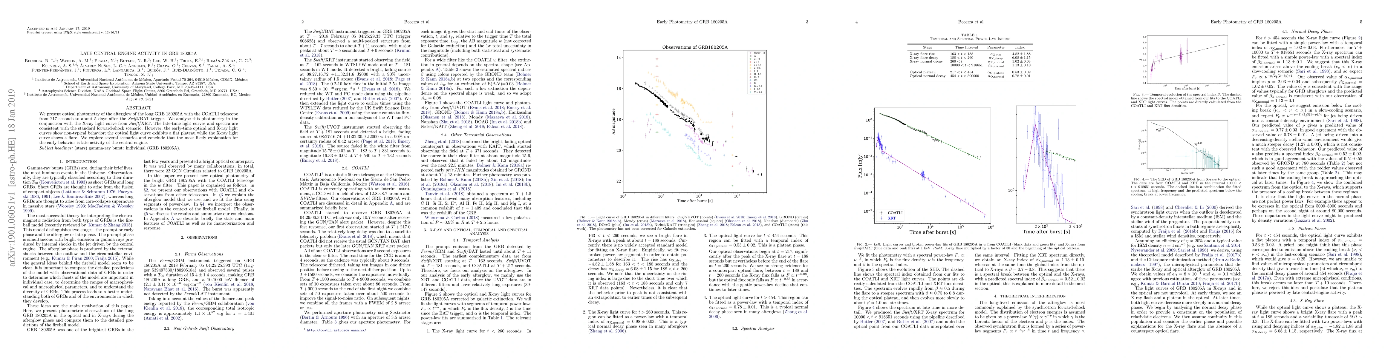We present optical photometry of the afterglow of the long GRB 180205A with the COATLI telescope from 217 seconds to about 5 days after the {\itshape Swift}/BAT trigger. We analyse this photometry in the conjunction with the X-ray light curve from {\itshape Swift}/XRT. The late-time light curves and spectra are consistent with the standard forward-shock scenario. However, the early-time optical and X-ray light curves show non-typical behavior; the optical light curve exhibits a flat plateau while the X-ray light curve shows a flare. We explore several scenarios and conclude that the most likely explanation for the early behavior is late activity of the central engine.