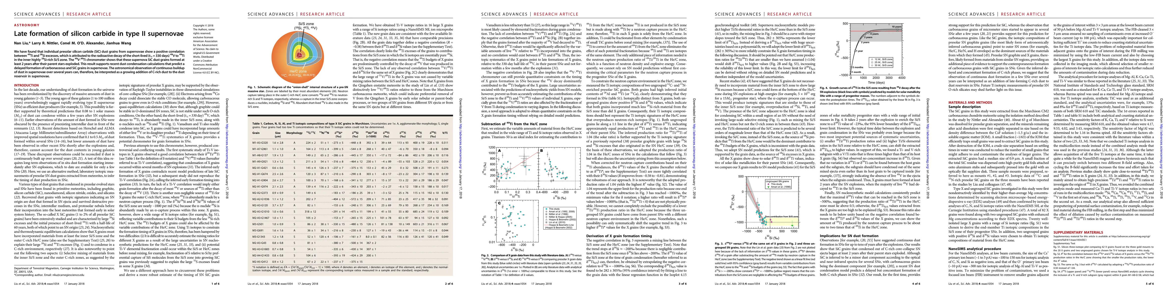 We have found that individual presolar silicon carbide (SiC) dust grains from supernovae show a positive correlation between 49Ti and 28Si excesses, which is attributed to the radioactive decay of the short-lived (t1/2=330 day) 49V to 49Ti in the inner highly 28Si-rich Si/S zone. The 49V-49Ti chronometer constrains that these supernova SiC dust grains formed at least two years after their parent stars exploded. This result supports recent dust condensation calculations that predict a delayed formation of carbonaceous and SiC grains in supernovae. The astronomical observation of continuous buildup of dust in supernovae over several years can, therefore, be interpreted as a growing addition of C-rich dust to the dust reservoir in supernovae.