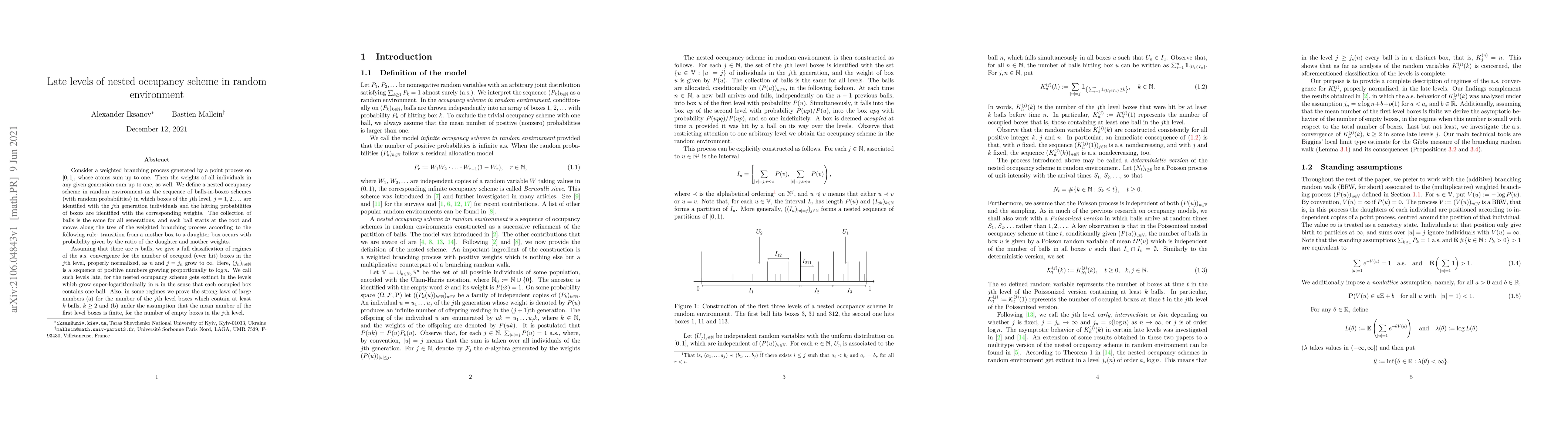 Consider a weighted branching process generated by a point process on $[0,1]$, whose atoms sum up to one. Then the weights of all individuals in any given generation sum up to one, as well. We define a nested occupancy scheme in random environment as the sequence of balls-in-boxes schemes (with random probabilities) in which boxes of the $j$th level, $j=1,2,\ldots$ are identified with the $j$th generation individuals and the hitting probabilities of boxes are identified with the corresponding weights. The collection of balls is the same for all generations, and each ball starts at the root and moves along the tree of the weighted branching process according to the following rule: transition from a mother box to a daughter box occurs with probability given by the ratio of the daughter and mother weights. Assuming that there are $n$ balls, we give a full classification of regimes of the a.s.\ convergence for the number of occupied (ever hit) boxes in the $j$th level, properly normalized, as $n$ and $j=j_n$ grow to $\infty$. Here, $(j_n)_{n\in\mathbb N}$ is a sequence of positive numbers growing proportionally to $\log n$. We call such levels late, for the nested occupancy scheme gets extinct in the levels which grow super-logarithmically in $n$ in the sense that each occupied box contains one ball. Also, in some regimes we prove the strong laws of large numbers (a) for the number of the $j$th level boxes which contain at least $k$ balls, $k\geq 2$ and (b) under the assumption that the mean number of the first level boxes is finite, for the number of empty boxes in the $j$th level.