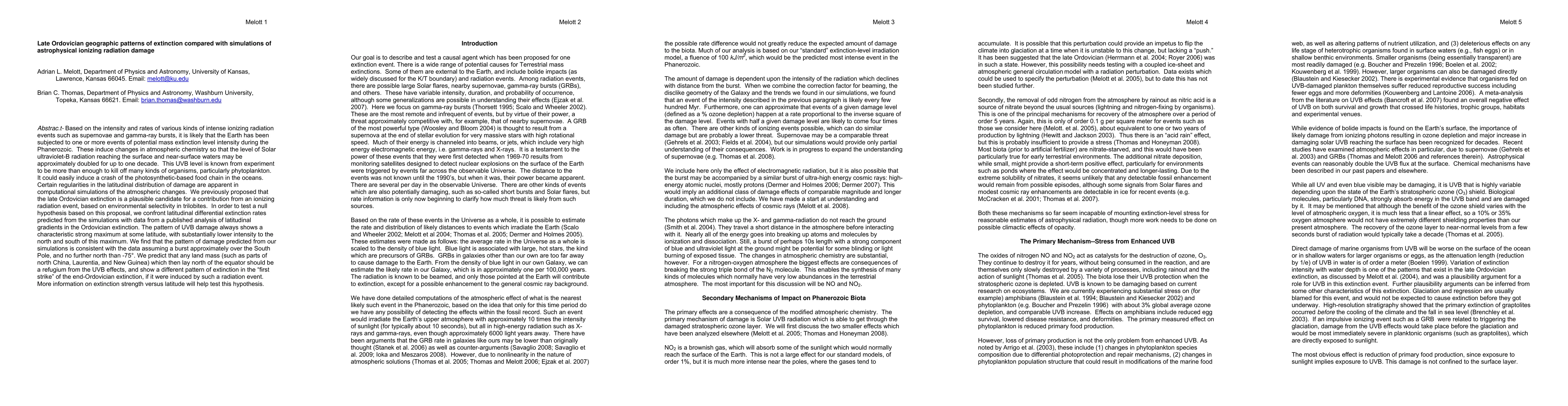 Based on the intensity and rates of various kinds of intense ionizing radiation events such as supernovae and gamma-ray bursts, it is likely that the Earth has been subjected to one or extinction level events during the Phanerozoic. These induce changes in atmospheric chemistry so that the level of Solar ultraviolet-B radiation reaching the surface and near-surface waters may be doubled for up to a decade. This UVB level is known from experiment to be more than enough to kill off many kinds of organisms, particularly phytoplankton. It could easily induce a crash of the photosynthetic-based food chain in the oceans. Regularities in the latitudinal distribution of damage are apparent in simulations of the atmospheric changes. We previously proposed that the late Ordovician extinction is a plausible candidate for a contribution from an ionizing radiation event, based on environmental selectivity in trilobites. To test a null hypothesis based on this proposal, we confront latitudinal differential extinction rates predicted from the simulations with data from a published analysis of latitudinal gradients in the Ordovician extinction. The pattern of UVB damage always shows a strong maximum at some latitude, with substantially lower intensity to the north and south of this maximum. We find that the pattern of damage predicted from our simulations is consistent with the data assuming a burst approximately over the South Pole, and no further north than -75 degrees. We predict that any land mass (such as parts of north China, Laurentia, and New Guinea) which then lay north of the equator should be a refuge from UVB effects, and show a different pattern of extinction in the first strike of the end-Ordovician extinction, if induced by such a radiation event.