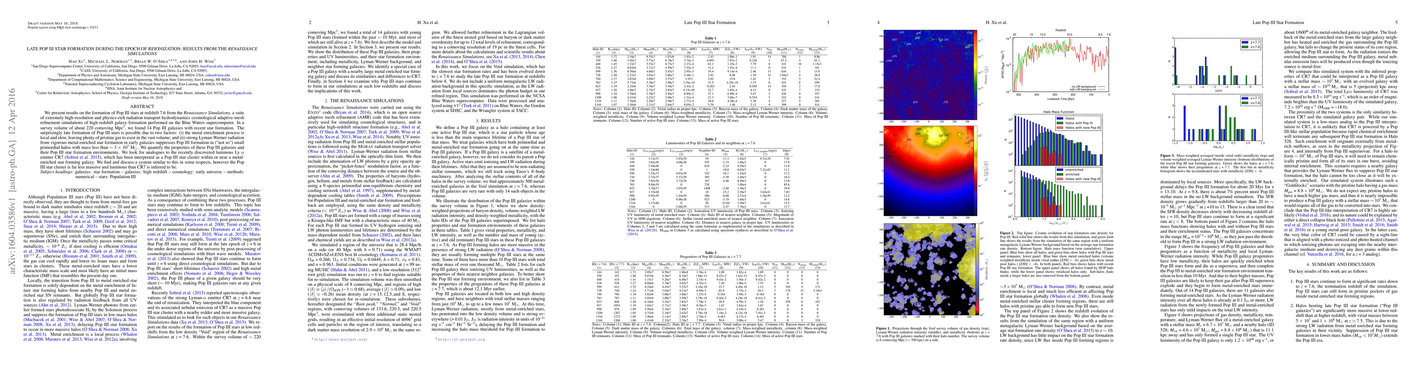 The Renaissance Simulations reveal the formation of 14 Pop III galaxies at redshift 7.6, indicating surprisingly late Pop III star formation due to slow metal enrichment and suppression of formation in small halos by Lyman-Werner radiation. A similar but less massive and luminous system to the CR7 Ly α emitter is identified.