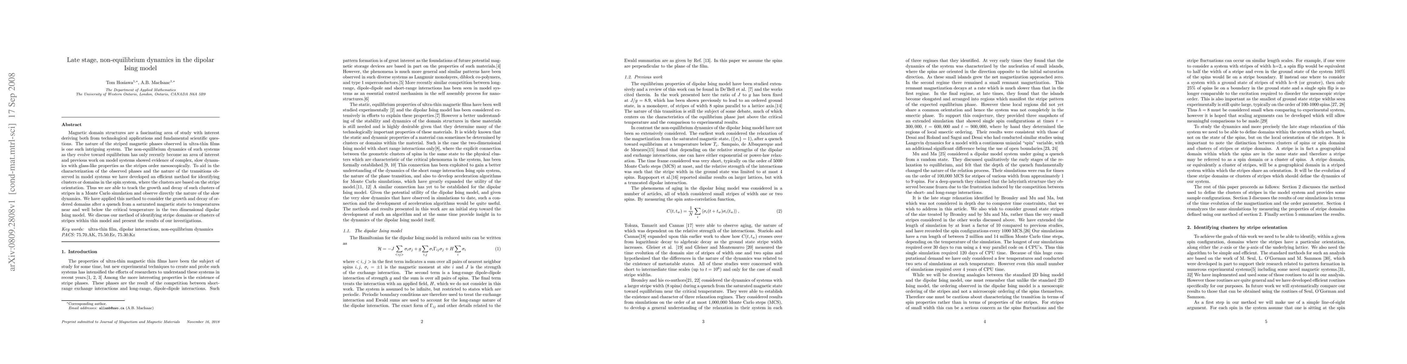This paper develops a method to identify and track stripe-oriented clusters in the dipolar Ising model, observing slow, non-equilibrium dynamics and glass-like properties during the formation of magnetic domains after a quench. The study reveals complex, slow dynamics in the evolution toward equilibrium in ultra-thin magnetic films.