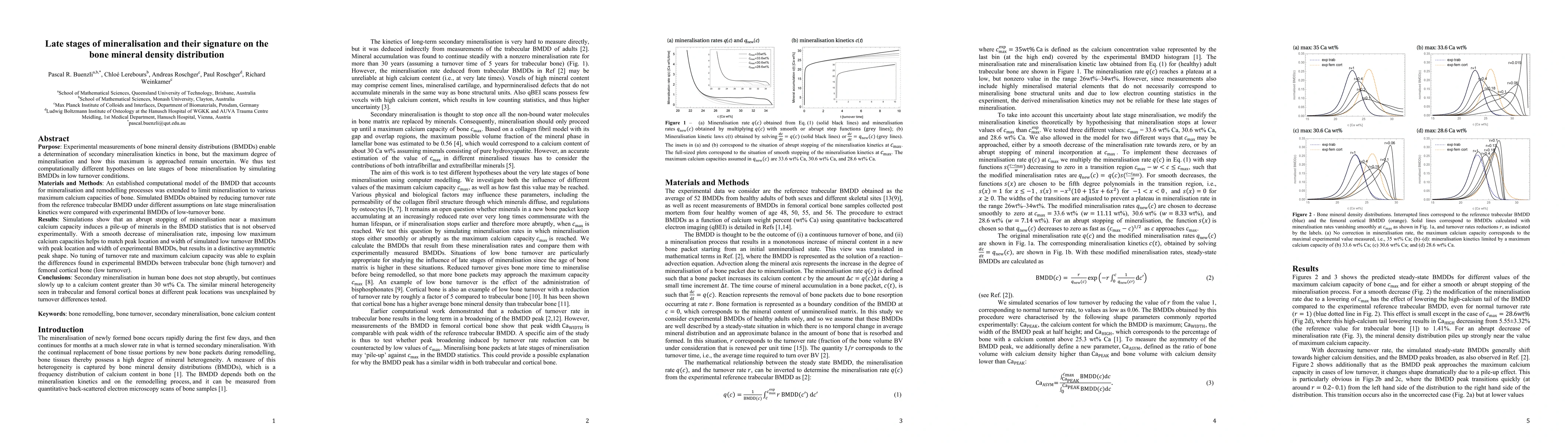 This study investigates the late stages of bone mineralisation through computational simulations of bone mineral density distributions (BMDDs) under low turnover conditions, finding that mineralisation does not stop abruptly but continues slowly, reaching a calcium content greater than 30 wt%. The results suggest that a smooth decrease in mineralisation rate better matches the observed BMDDs, though differences between trabecular and cortical bone BMDDs remain unexplained.