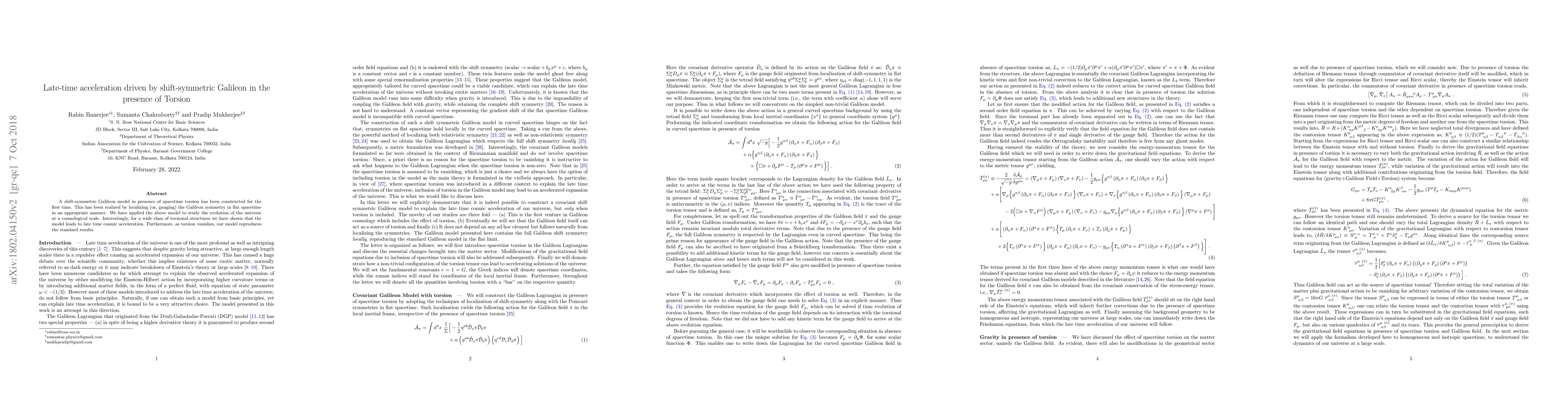 A shift-symmetric Galileon model in presence of spacetime torsion has been constructed for the first time. This has been realized by localizing (or, gauging) the Galileon symmetry in flat spacetime in an appropriate manner. We have applied the above model to study the evolution of the universe at a cosmological scale. Interestingly, for a wide class of torsional structures we have shown that the model leads to late time cosmic acceleration. Furthermore, as torsion vanishes, our model reproduces the standard results.