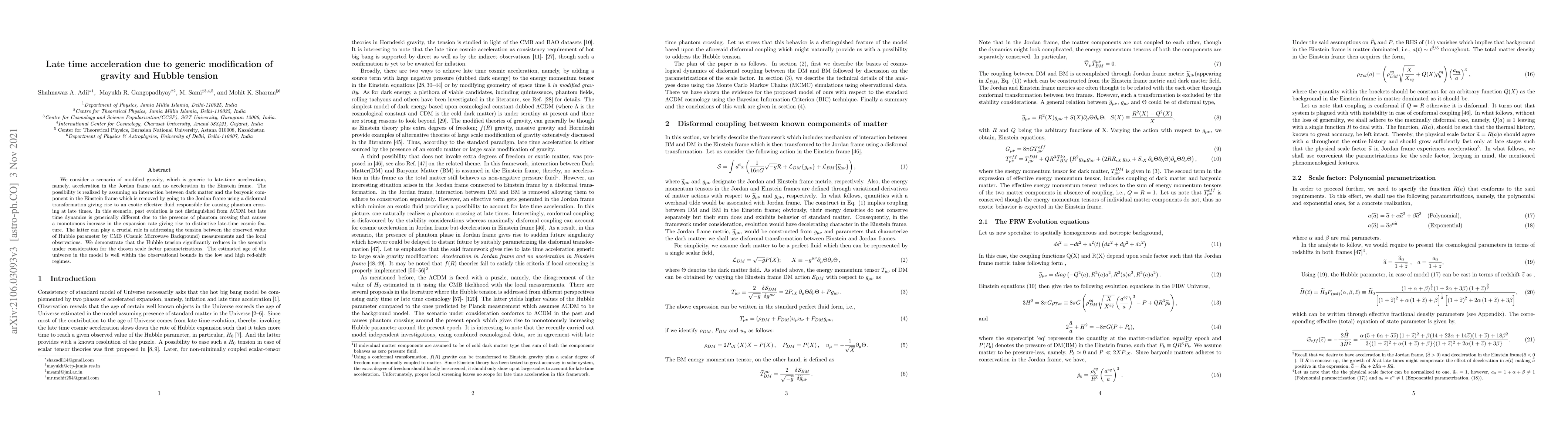 This paper explores a modified gravity model that explains late-time cosmic acceleration without affecting past evolution, addressing the Hubble tension between CMB and local observations. The model uses a disformal transformation to create an exotic fluid causing phantom crossing, leading to a distinct late-time expansion rate.