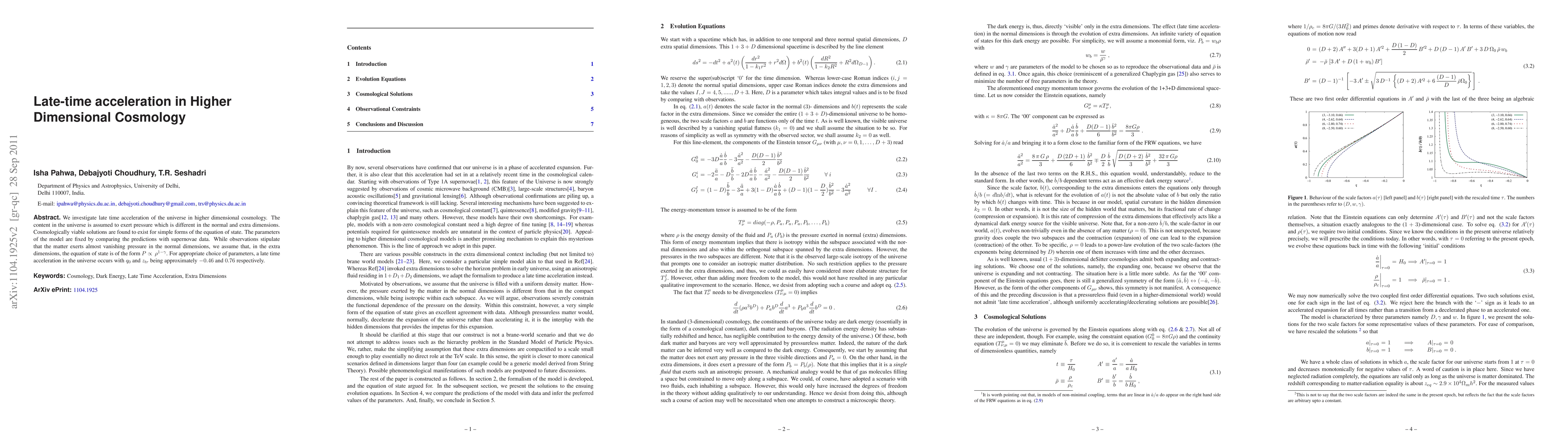 Research investigates late-time acceleration in higher dimensional cosmology, finding viable solutions for simple forms of equation of state, with parameters fixed to match supernovae data, leading to approximately -0.46 q0 and 0.76 ztr.
