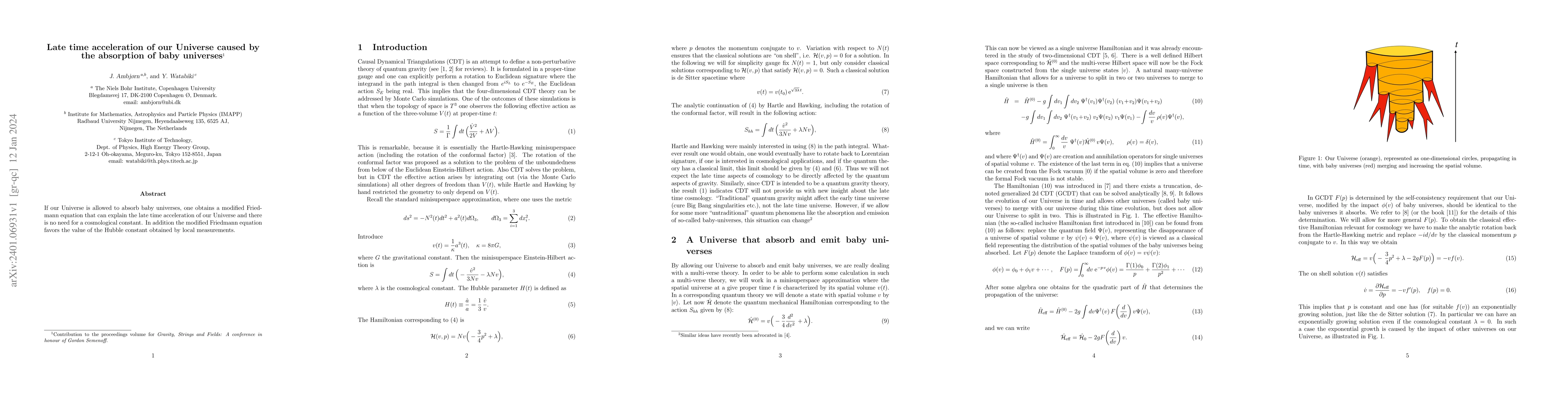 Summary: This paper proposes that the late time acceleration of our Universe can be explained by the absorption of baby universes, leading to a modified Friedmann equation that eliminates the need for a cosmological constant and aligns with local Hubble constant measurements.