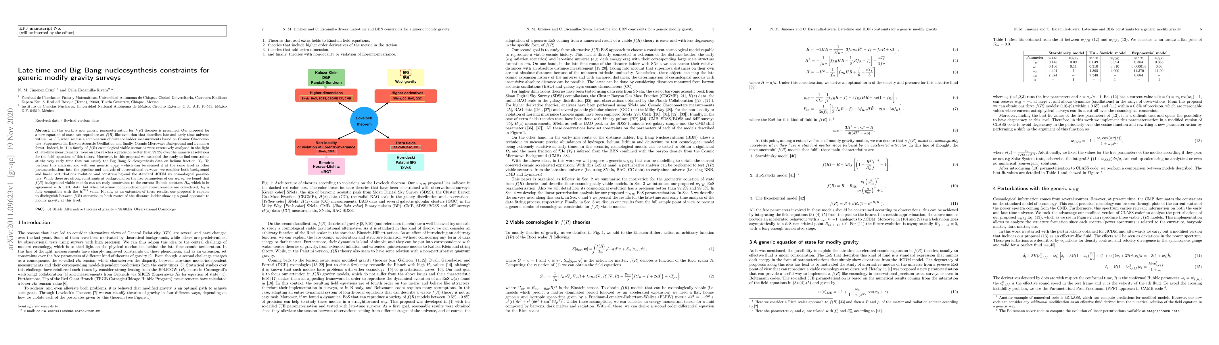 In this work, a new generic parameterisation for $f(R)$ theories is presented. Our proposal for a new equation of state can reproduce an $f(R)$-like evolution that describes late and early time universe within 1-$\sigma$ C.L when we use a combination of distance ladder measurements based on Cosmic Chronometers, Supernovae Ia, Baryon Acoustic Oscillation and finally, Cosmic Microwave Background and Lyman-$\alpha$ forest. Indeed, a family of $f(R)$ cosmological viable scenarios were extensively analysed in the light of late-time measurements, were an Eos reaches a precision better than $99.2\%$ over the numerical solutions for the field equations of this theory. Moreover, in this proposal we extended the study to find constraints at the very early time that can satisfy the Big Bang Nucleosynthesis data on helium fraction, $Y_{p}$. To perform this analysis, and with our generic $w_{f(R)}$ --which can be seemed it at the same level as other parameterisations into the pipeline and analysis of observational surveys-- we consider both background and linear perturbations evolution and constrain beyond the standard $\Lambda$CDM six cosmological parameters. While there are strong constraints at background on the free parameters of our $w_{f(R)}$, we found that $f(R)$ background viable models can set early constraints to the current Hubble constant $H_0$, which is in agreement with CMB data, but when late-time model-independent measurements are considered, $H_0$ is fully compatible with the $R^{H18}$ value. Finally, as an extension of these results, our proposal is capable to distinguish between $f(R)$ scenarios at both routes of the distance ladder showing a good approach to modify gravity at this level.