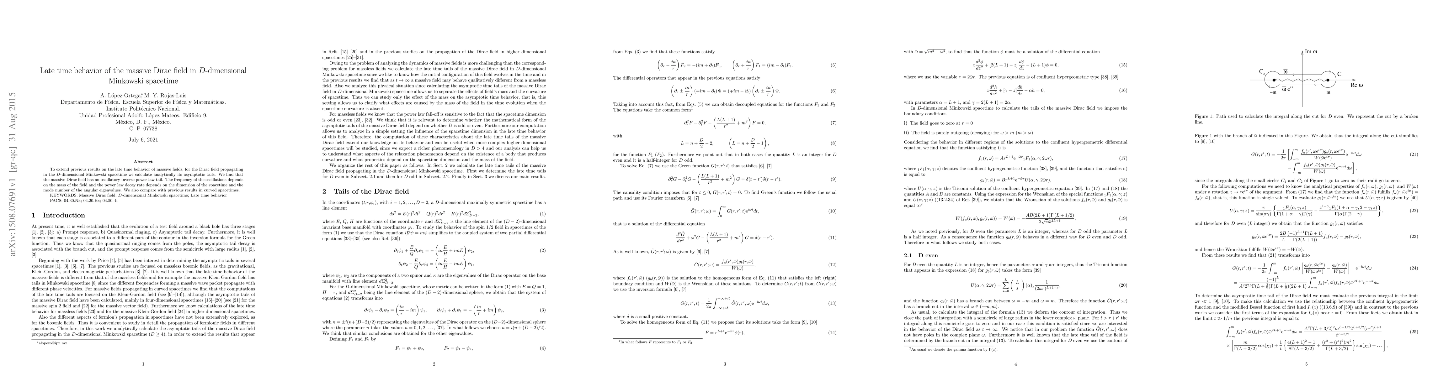 To extend previous results on the late time behavior of massive fields, for the Dirac field propagating in the D-dimensional Minkowski spacetime we calculate analytically its asymptotic tails. We find that the massive Dirac field has an oscillatory inverse power law tail. The frequency of the oscillations depends on the mass of the field and the power law decay rate depends on the dimension of the spacetime and the mode number of the angular eigenvalues. We also compare with previous results in curved spacetimes.